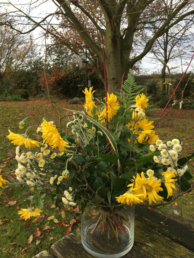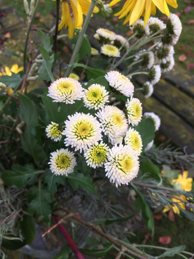 In the posy this week is Chrysanthemum Stallion Yellow and white Swan from Cheshire family nursery Chrysanthemums Direct. Bought as plugs from RHS autumn show. I think they cost around £1 each, and have made good strong plants in a year. I’m an organic gardener, and on my potting shed table is some natural fertiliser I’m trying out from PlantGrow. I’ll let you know how I get on with it.
