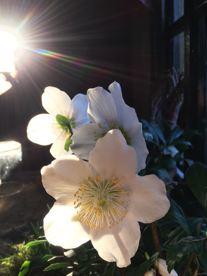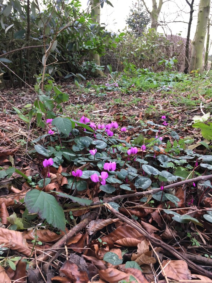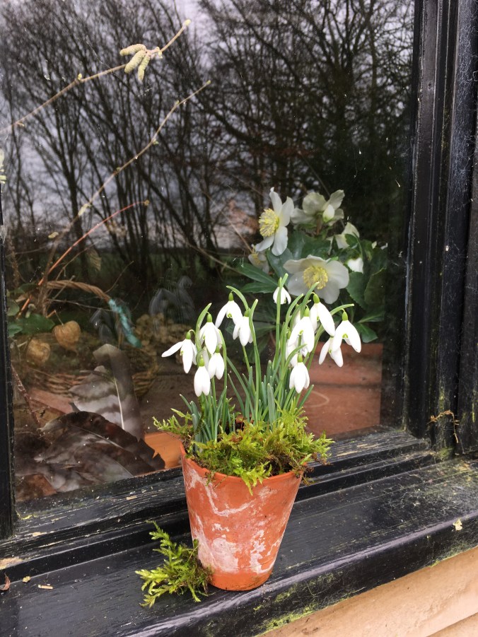 All winter I’ve found a kind of sanctuary in the potting shed. There’s a deep peaceful silence. A protection from the cold. A place to think. I can plot the progress of the seasons from the pottingshed window. Just now I can see gaunt willows bordering the pond. They look like charcoal drawings. I think of my farming ancestors who would have lopped the willows to make sheepfolds at this time of year.