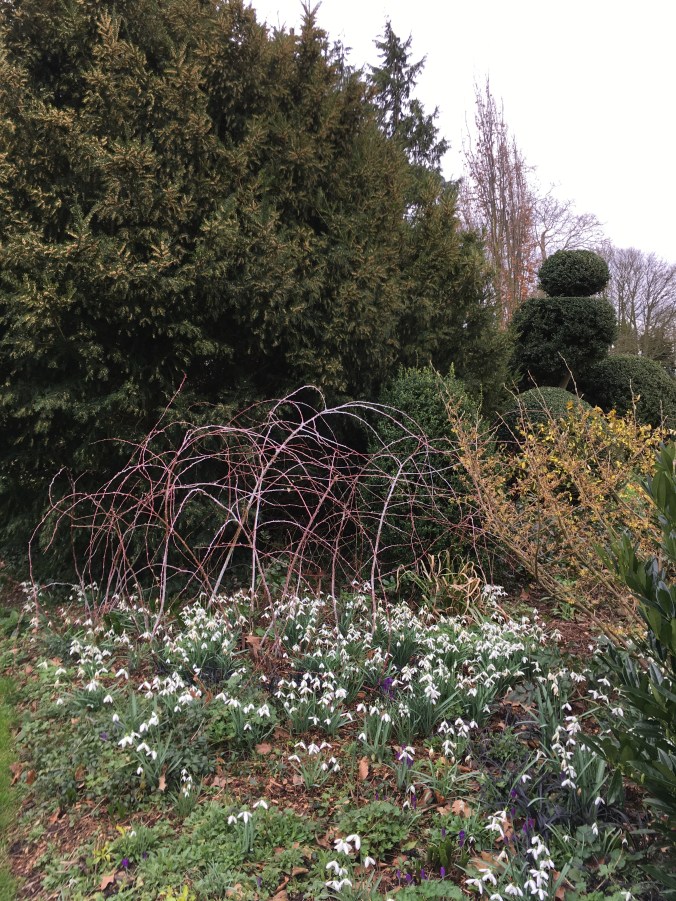 There are some glorious planting combinations. Silver stems of Rubus Golden Vale stand out against the dark yew background, with snowdrops as groundcover. Everywhere there’s yew and box hedges and topiary.