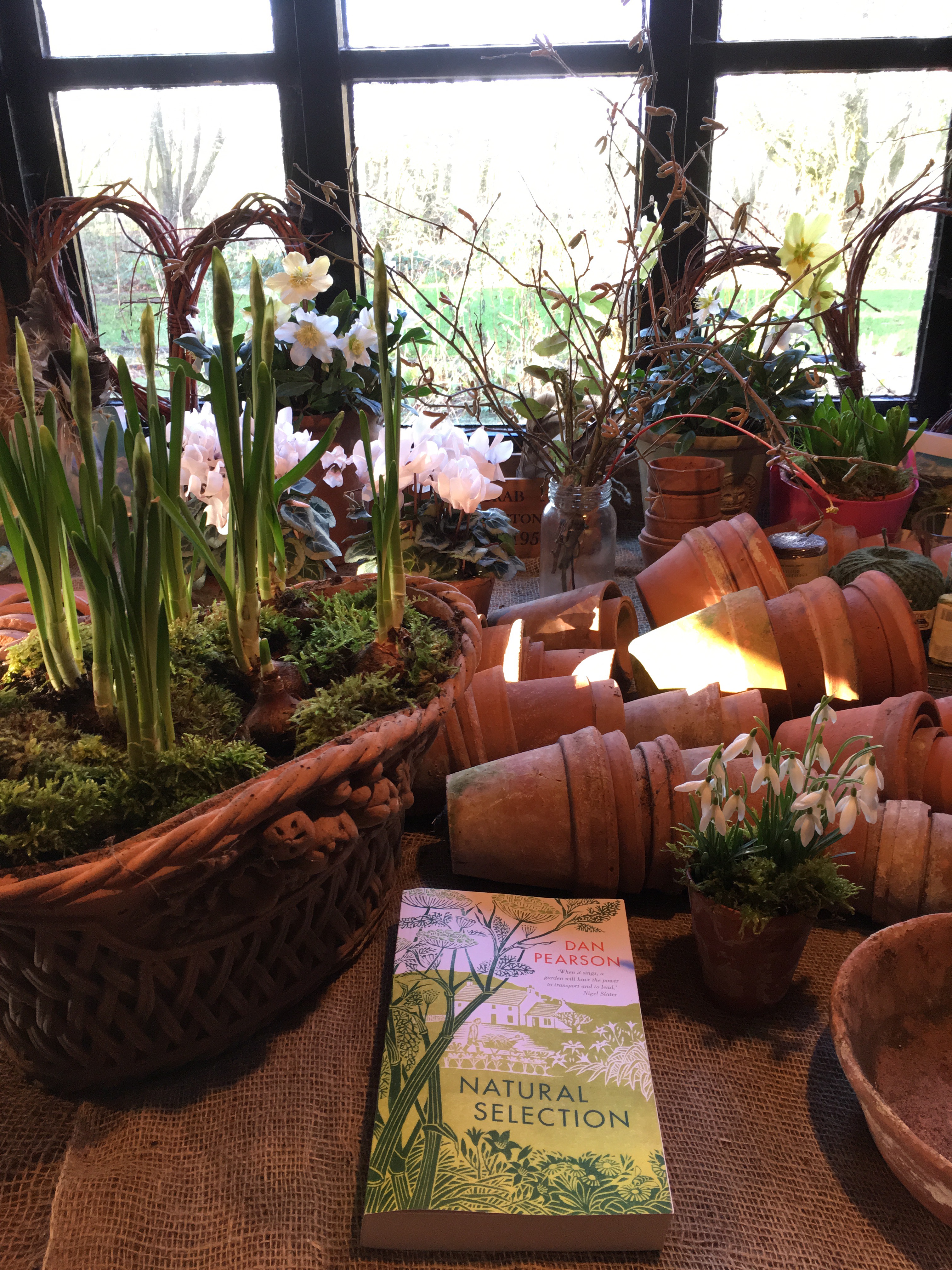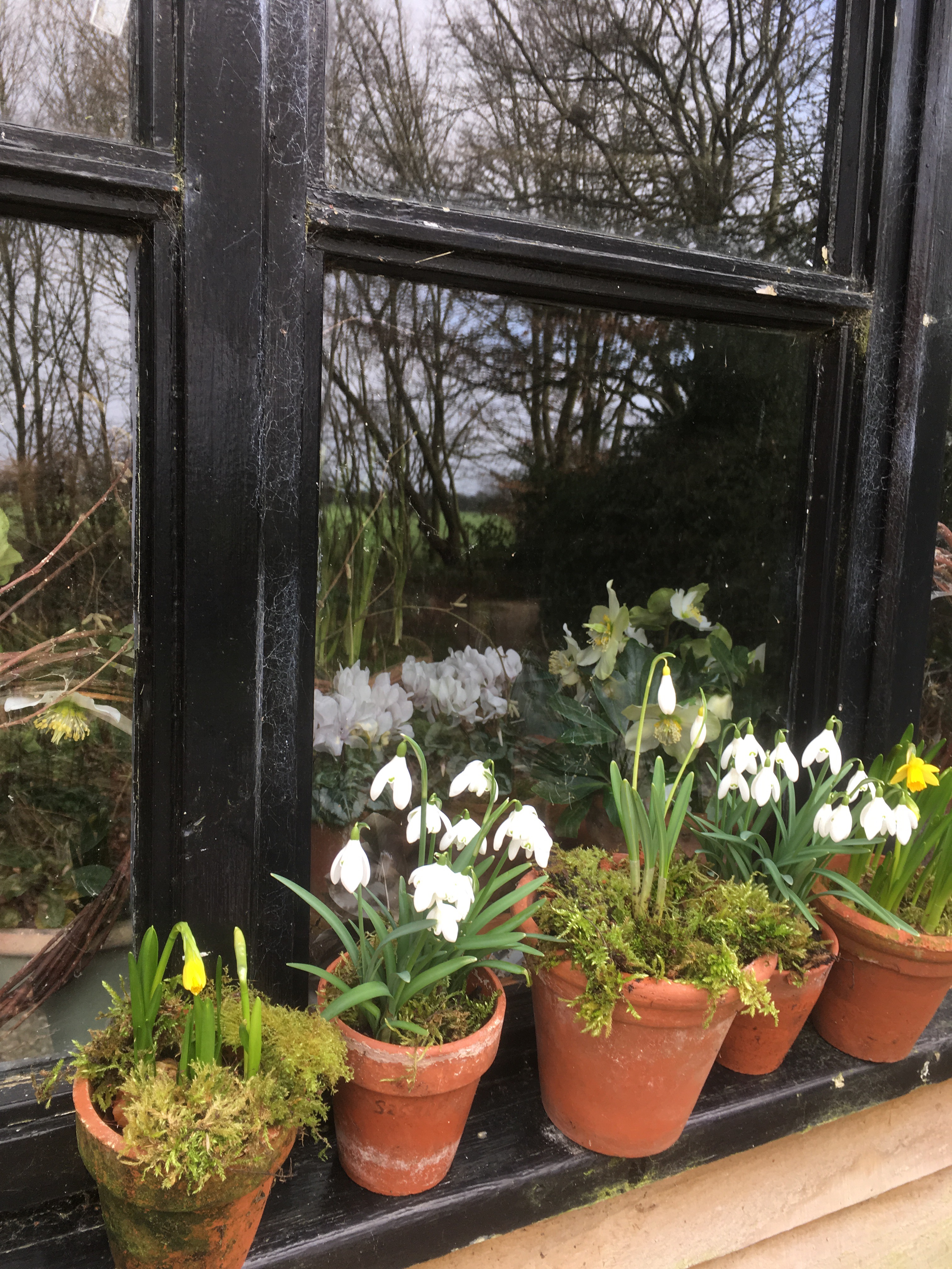 All winter I’ve found a kind of sanctuary in the potting shed. There’s a deep peaceful silence. A protection from the cold. A place to think. I can plot the progress of the seasons from the pottingshed window. Just now I can see gaunt willows bordering the pond. They look like charcoal drawings. I think of my farming ancestors who would have lopped the willows to make sheepfolds at this time of year.