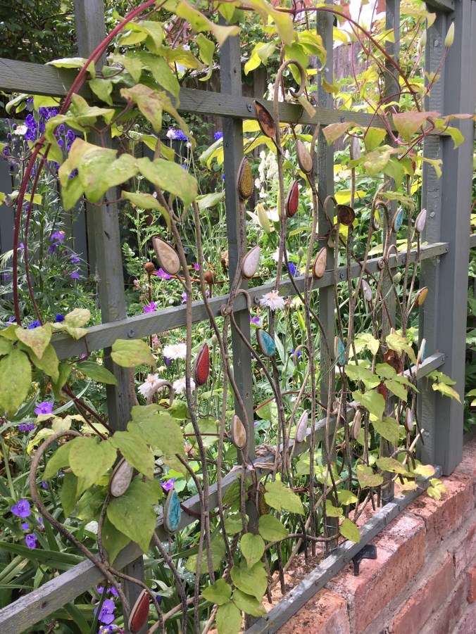 We spotted these pretty metal plant supports with jewel-like flowers.