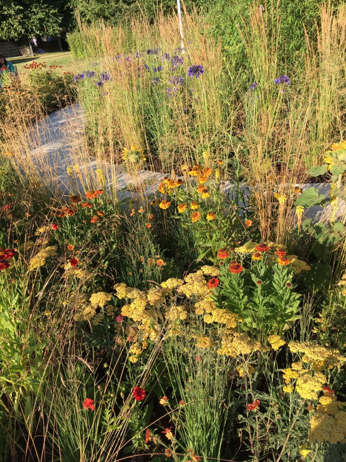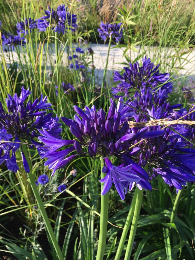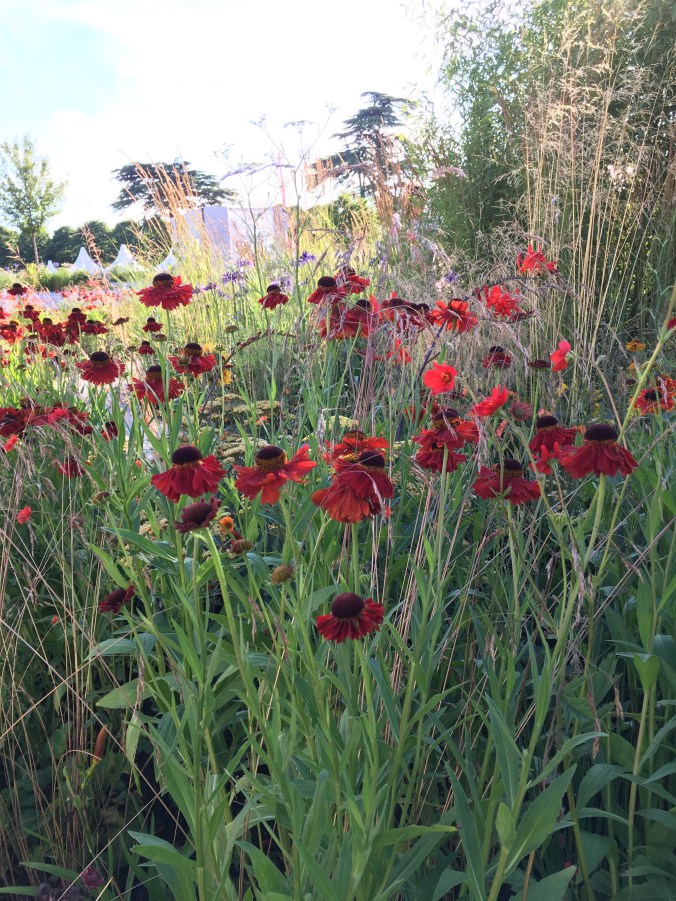 We found plenty of places to sit and relax in the garden. This cosy seat is enveloped in a pink planting scheme of astrantia, geranium and alliums. We loved the little green checked cushions which were a feature on all benches and seats throughout the garden.