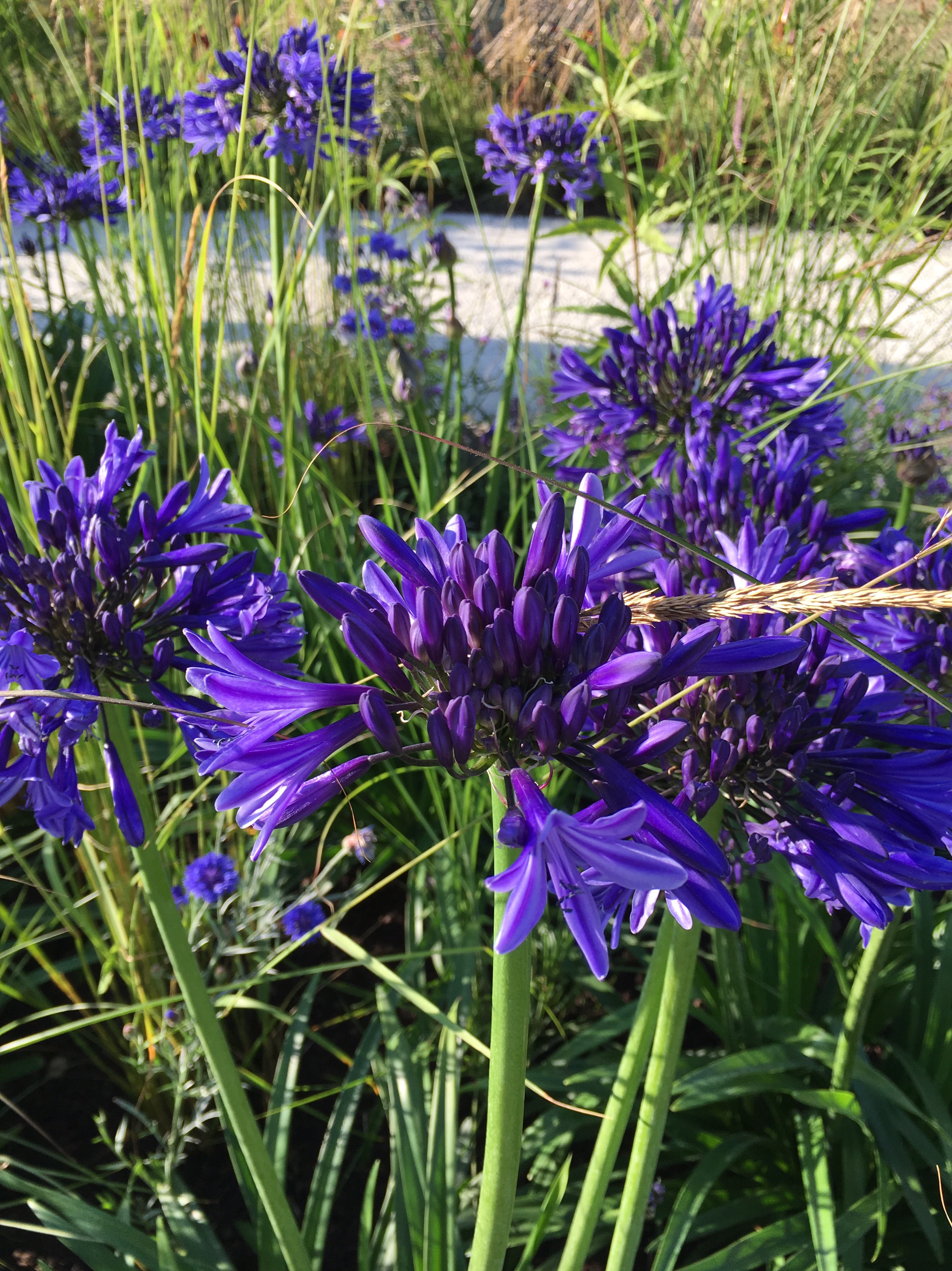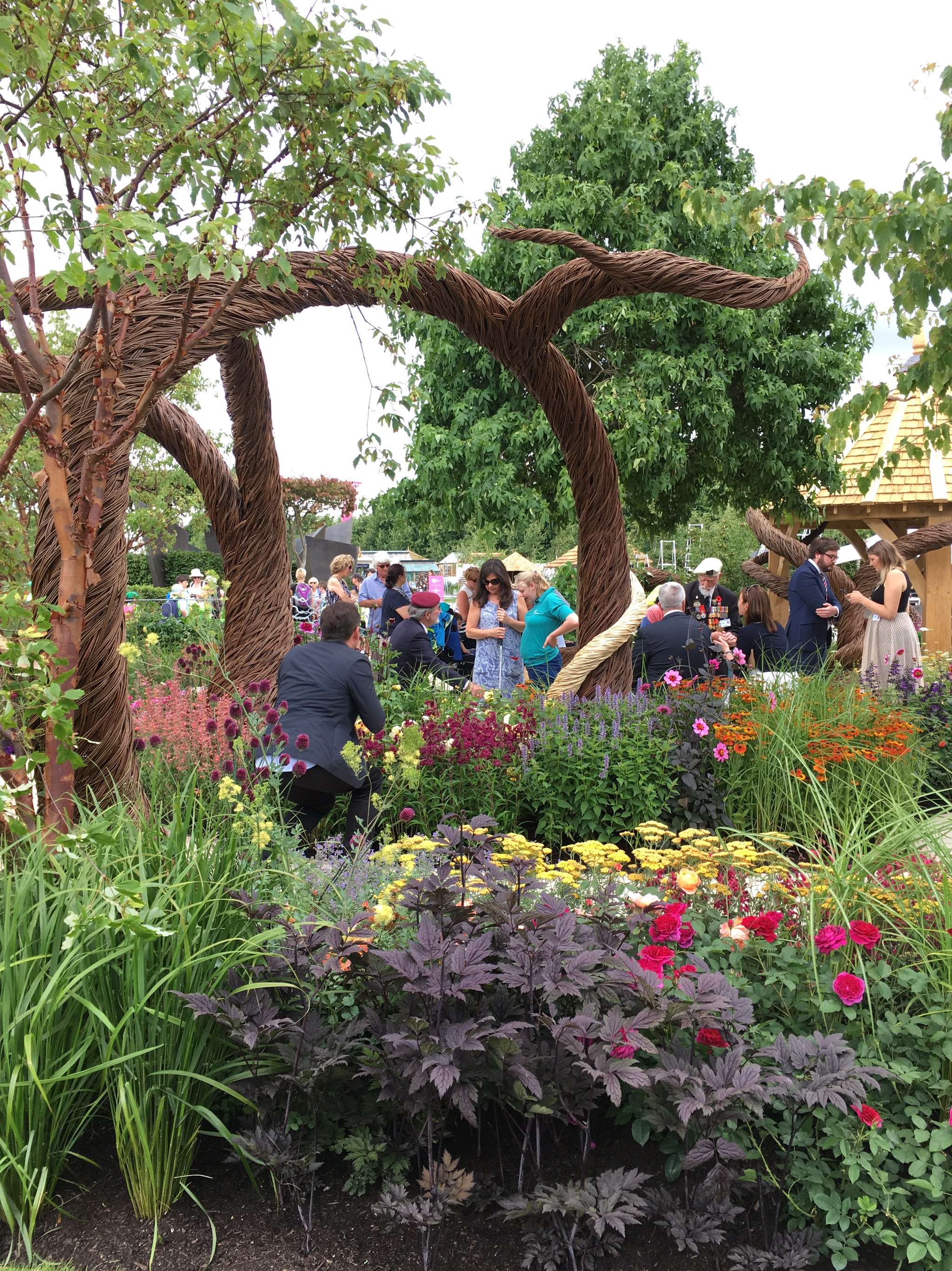 We found plenty of places to sit and relax in the garden. This cosy seat is enveloped in a pink planting scheme of astrantia, geranium and alliums. We loved the little green checked cushions which were a feature on all benches and seats throughout the garden.
