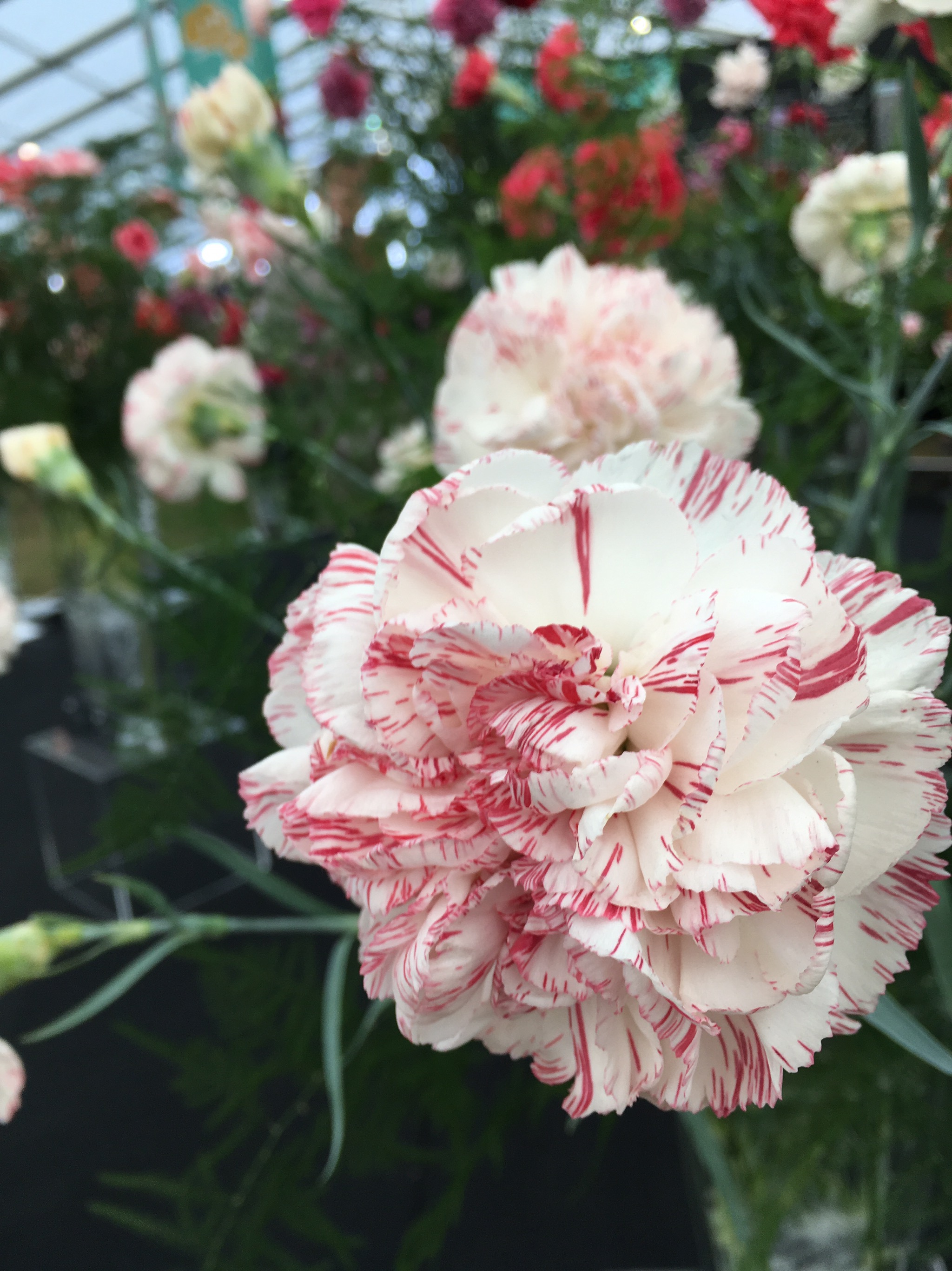 We spotted these pretty metal plant supports with jewel-like flowers.