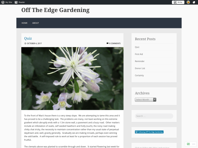 in just about every bouquet of flowers this summer I managed to include one of these white water lily dahlias. This tuber cost £1 from Wilkinson’s in the spring. I started it off in a pot in the greenhouse and planted it out end of May. It grew to nearly 5 feet and has been smothered in flowers. I will pay better attention to earwigs next year, putting plant pots of straw or corrugated cardboard on canes amongst the plants. As I don’t like to kill anything, the straw etc will be shaken out in a wild part of the garden every morning. Interestingly, the earwigs didn’t attack a deep red cactus-flowering dahlia growing right along side.