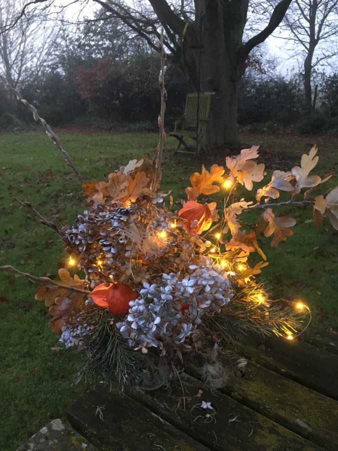 Simply melt a block of lard in a heavy based jam pan. Add bird seed, grated cheese, breadcrumbs, apple peelings, dried fruit and crushed peanuts. You can spoon the mixture onto the fir cones. It makes a marvellously messy project for young children. If time is short, you can simply add the fir cones to the pan and stir around. The mixture gets caught up in the open fir cone scales. Tie with a piece of festive ribbon, or some string and wrap in foil to dry. I’ve hung mine on the tips of my beech tree. Squirrels so far can’t get to them because the tips of the branches are too springy for them. I’ve also dangled them along my office window where a little robin comes each day for treats.