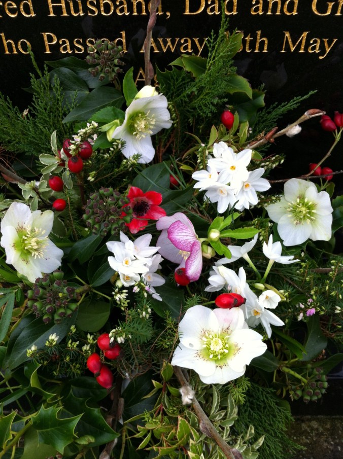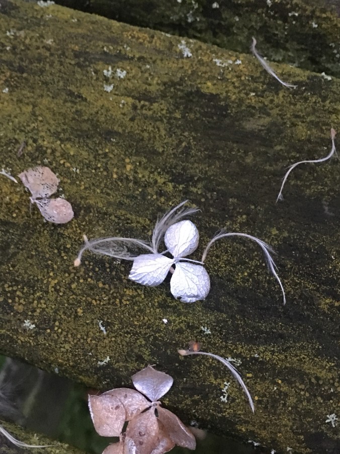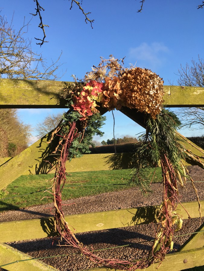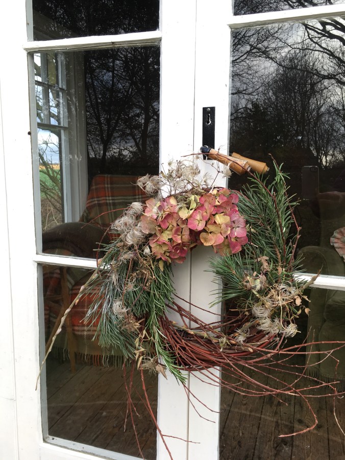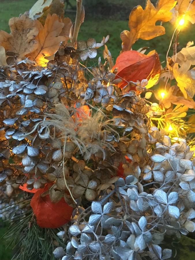 Each week I take in flowers I’ve grown in my garden. For Christmas I’ve harvested some Annabelle hydrangea seed heads and sprayed them silver. I wrote about these arrangements Here.