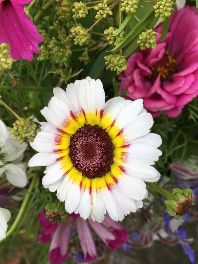 In this tiny posy, I’ve placed them with cosmos, fringed dianthus, and sprigs of blue agapanthus. They’ll last five days in a vase.