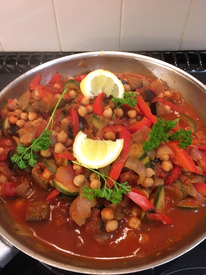 I tried the Haddock with Ratatouille recipe which is easy to follow and quick to make- very important after a busy day at work. I cooked diced onions, aubergines, courgettes, red pepper in 2 tbpsn olive oil. Then added a can of tomato passata and a tin of chickpeas. 2tbspn soy sauce, 2 tbsp herbs de Provence, and 4 garlic cloves (crushed) added flavour. I wouldn’t have thought of adding finely-grated zest and juice of half a lemon, but it’s the twist the recipe needs to make it different from anything I’ve made before. I didn’t have any bay leaves, but 2 were mentioned in the recipe. The pan was covered and simmered for 15 minutes while I baked the fish in the oven and added boiling water to a pan of couscous. It was delicious! A nice speedy weekday dinner, incorporating lots of veg, with the minimum of fuss. Sorry there are no photos of the finished meal. It was so tempting- we ate it straight away!