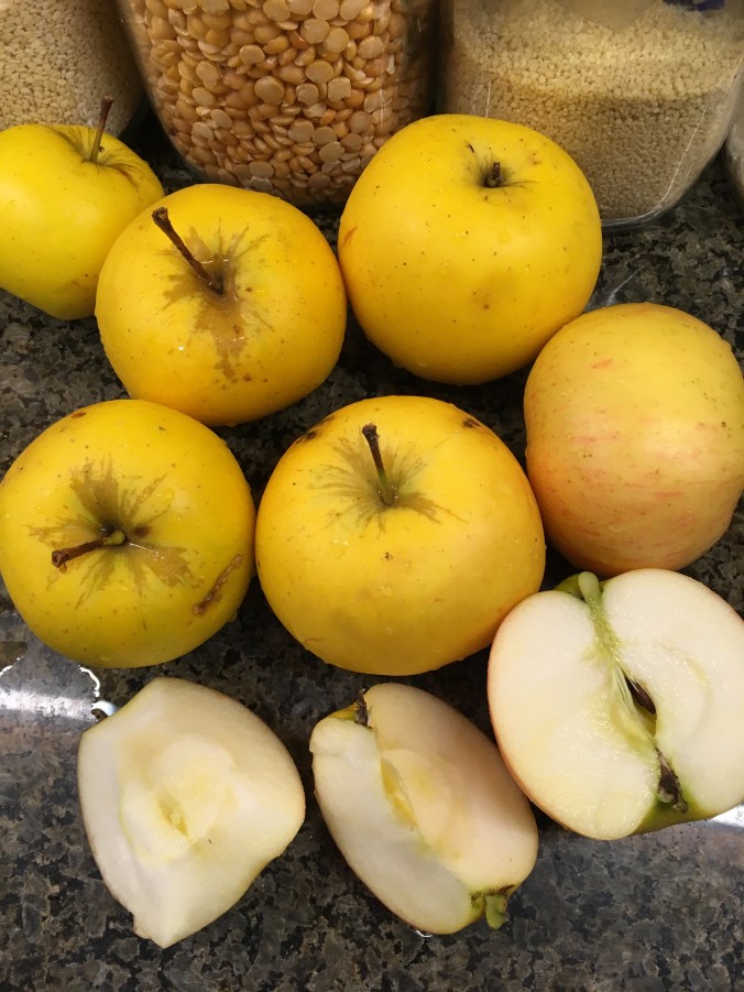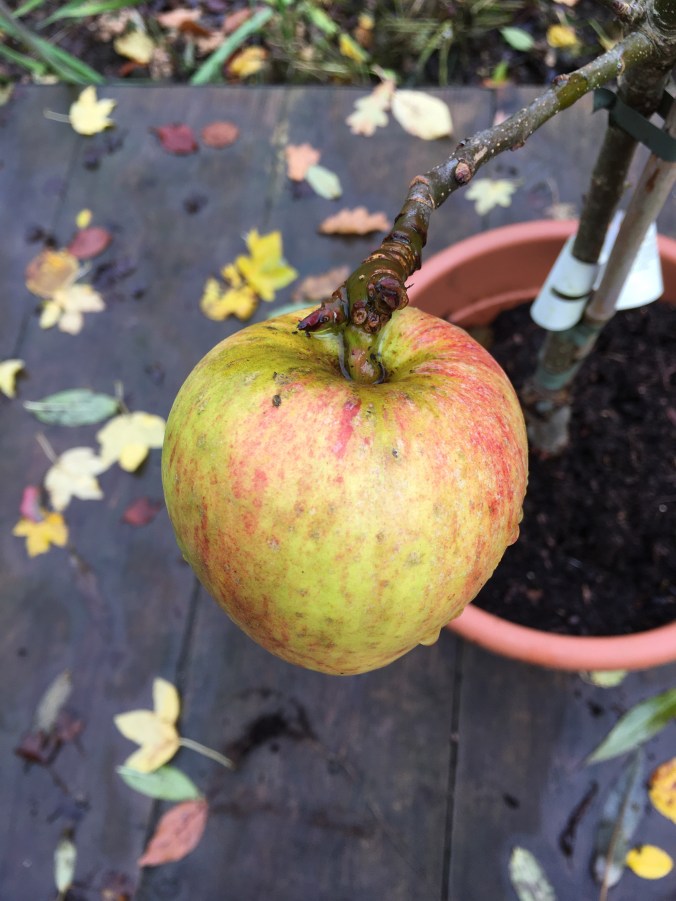 Mooching about the garden, I find a mini potted fruit tree with its first apple. This is a desert apple, Malini, growing on a dwarfing root stock. I’m growing it in a 12″ pot and it will go with my youngest daughter when she flies the nest. I have a patio full of tiny fruit trees, to form a fledgling orchard, for her first home.