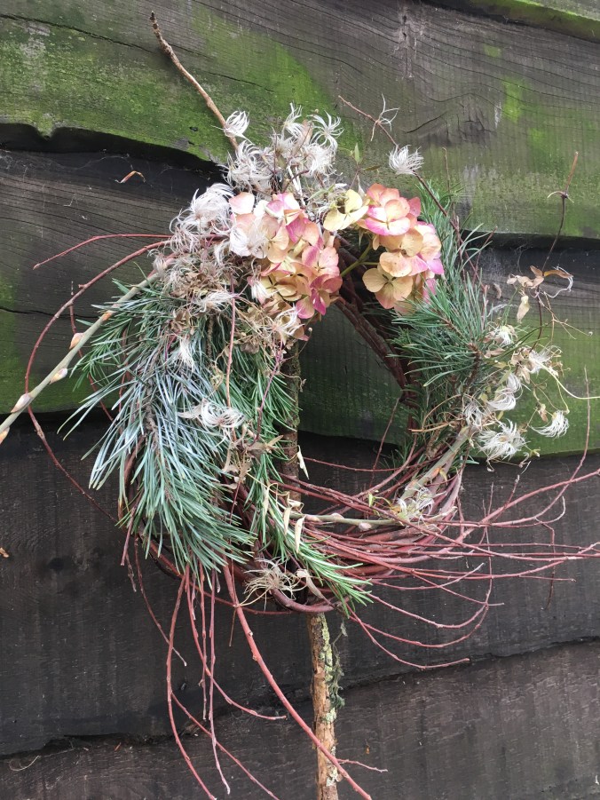 Finally, as a change from gold, I find these beautiful – and very late roses in the front garden hedge. I believe they are the Ballerina Rose, a really good, disease-resistant variety. It flowers on and off all summer- and right up until Christmas. In fact, these roses will be going into my Christmas door wreaths, along with rosehips, old man’s beard wild clematis, fir cones and crab apples. Guaranteed to bring good cheer.