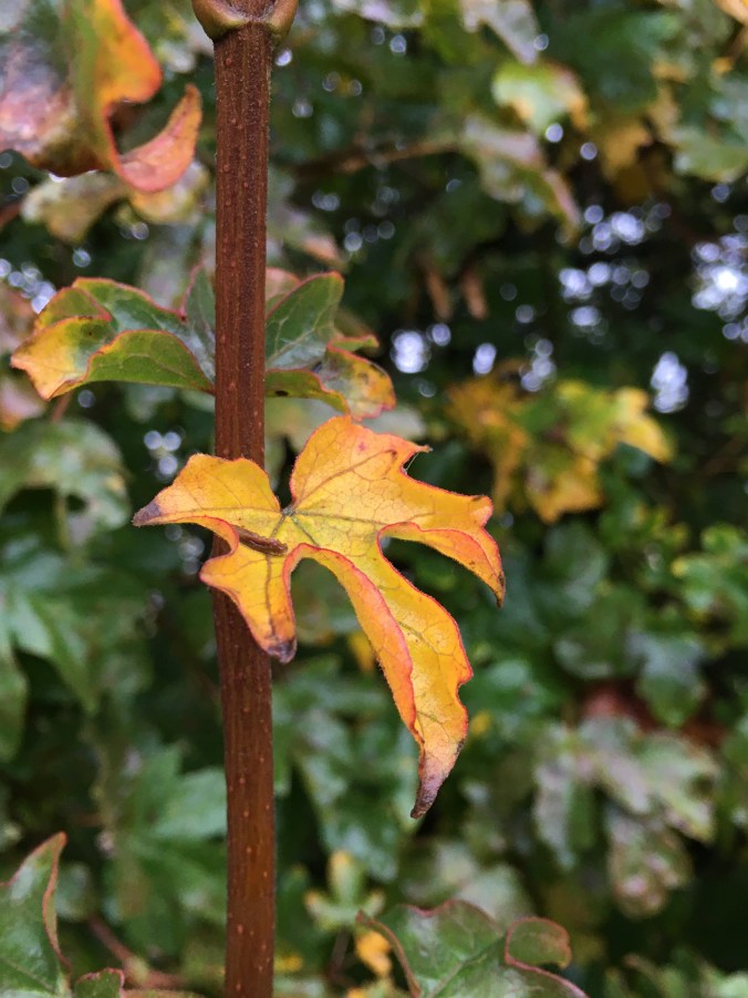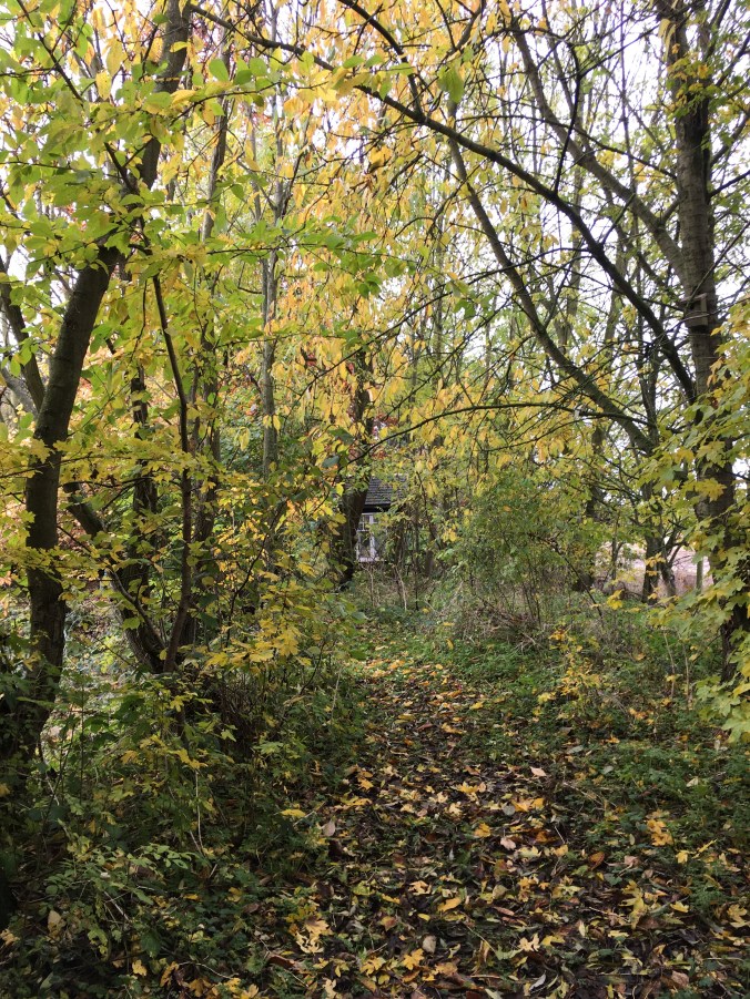 Looking up, you can see there’s plenty of twiggy growth in this garden. I rather like the pattern of black stems and yellow maple leaves. It looks like a pen and ink drawing and someone has ‘scribbled’ across the skyline.