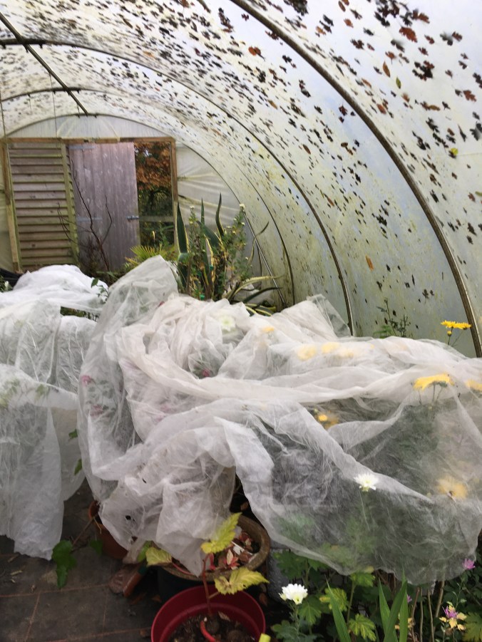 Into the poly tunnel, I find some pretty chrysanthemums coming into flower. These are the hardy Stallion variety. They can cope with the cold, but do better if protected from rain. They are grown in 10″ pots, stood outdoors all summer, and brought under cover in October.