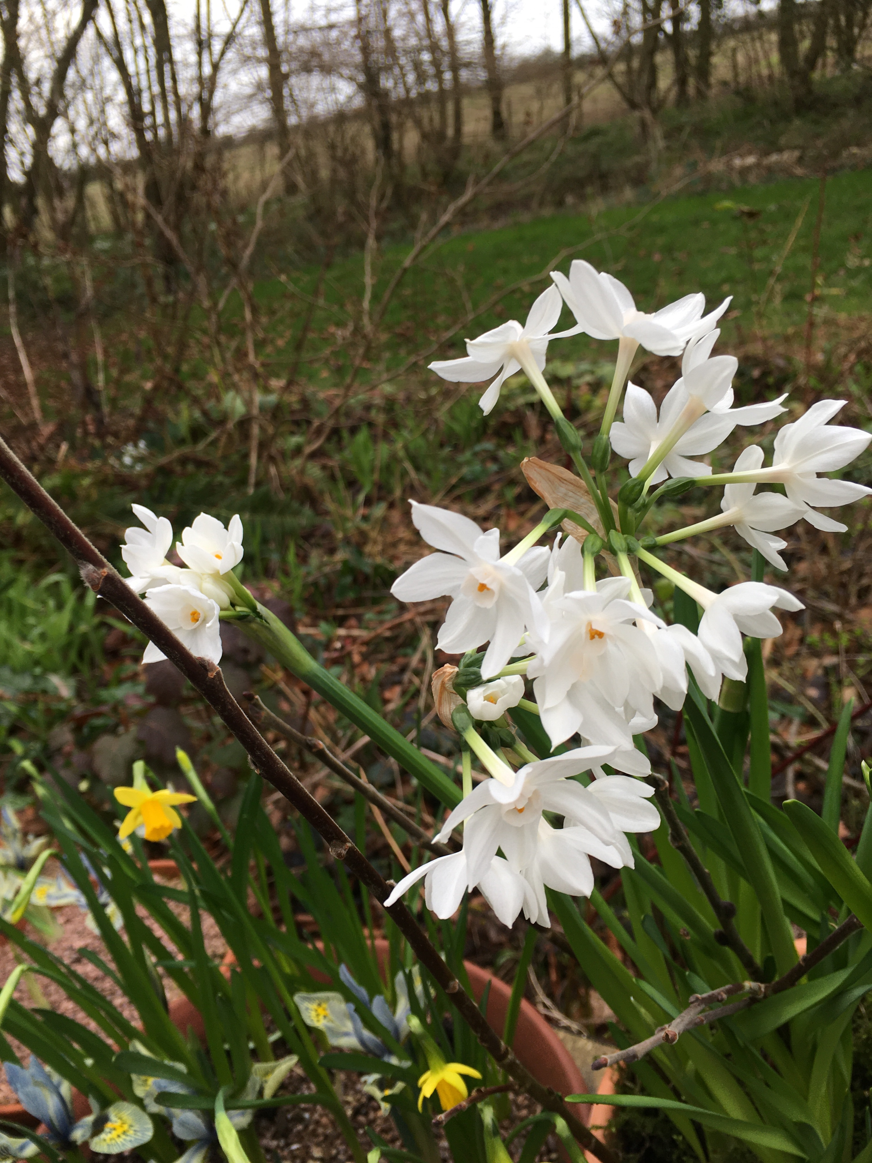 My favourite snowdrop Galanthus Madeleine has been stunning again this year. I bought it three years ago from Thenford Gardens. I shared a pot of six bulbs with a friend. It’s the most I’ve ever paid for a pot of snowdrops, but it was worth it. This year, I had nine flowers and plenty of extra leaves which shows it is happy and spreading. Pictured above are some of them on show in the potting shed. I love the way the petals fold around each other like the wings of a bee. So delicate.