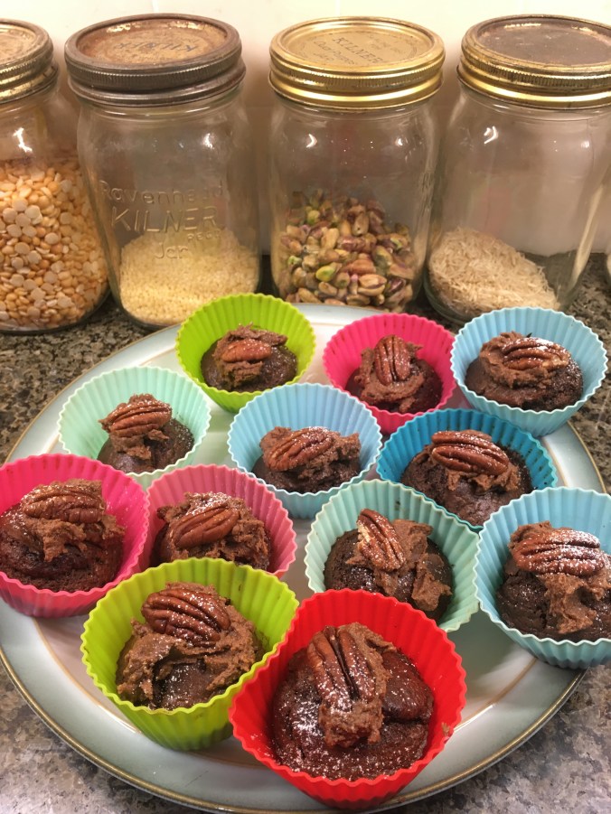 Mix the buttercream ingredients together. If using butter, slightly warm in the microwave to incorporate. Pile 1 tsp of buttercream on top of the cakes and add 1 pecan half for decoration. You can use any nuts if you don’t have pecans. It’s very nice with almond slices or hazel nuts.