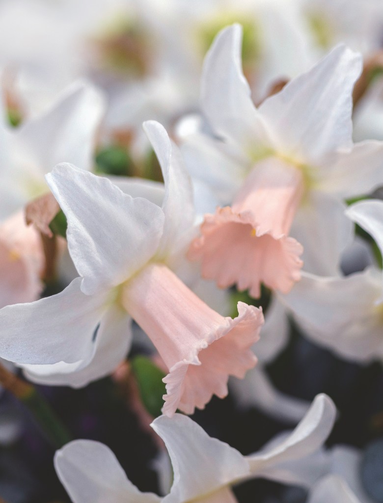 “The white petals are elegantly reflexed due to the flower’s Cyclamineus heritage and their waxy, rather than papery substance comes from a crystalline finish, giving the flowers a gleaming, sparkling quality. The snout is similarly shapely, with a prominent, slightly flared funnel, ribbed along its length with a kicked-back frill to the end; forming a cylinder that is pistachio-green at the very base before becoming a pale yellow-peach followed by a rapid transition to a pale and lovely lavender pinkish hue.” Lilac charm was bred by Brian Duncan in Ireland. It’s a fantastic and eye-catching variety for the show bench, the garden and for cutting.