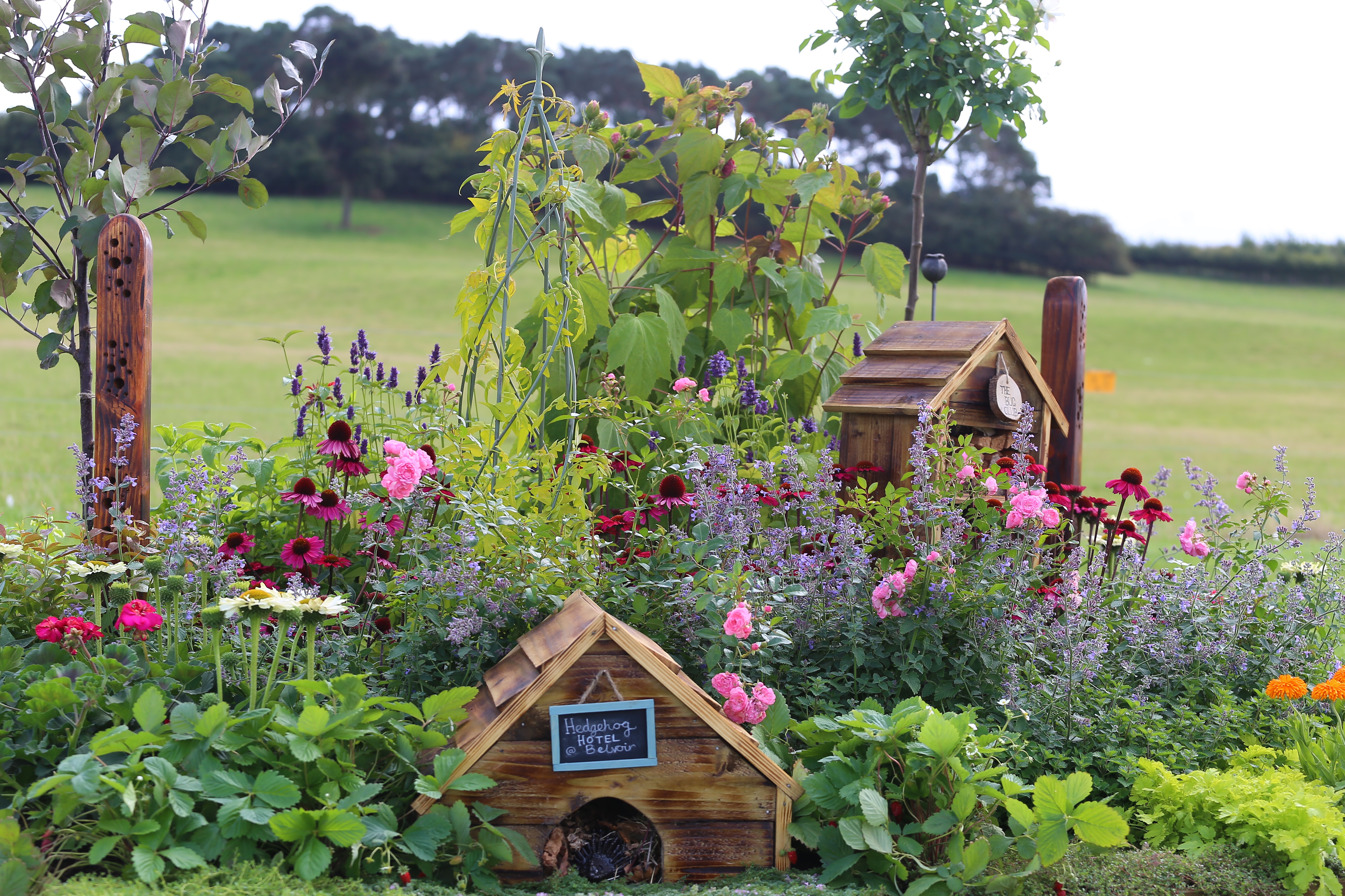 An A-Frame structure made from hazel poles purchased from farm fencing suppliers. These are used as binders in hedge laying. Ammi, gladioli and cosmos are planted down the middle. Calendula on the outsides.