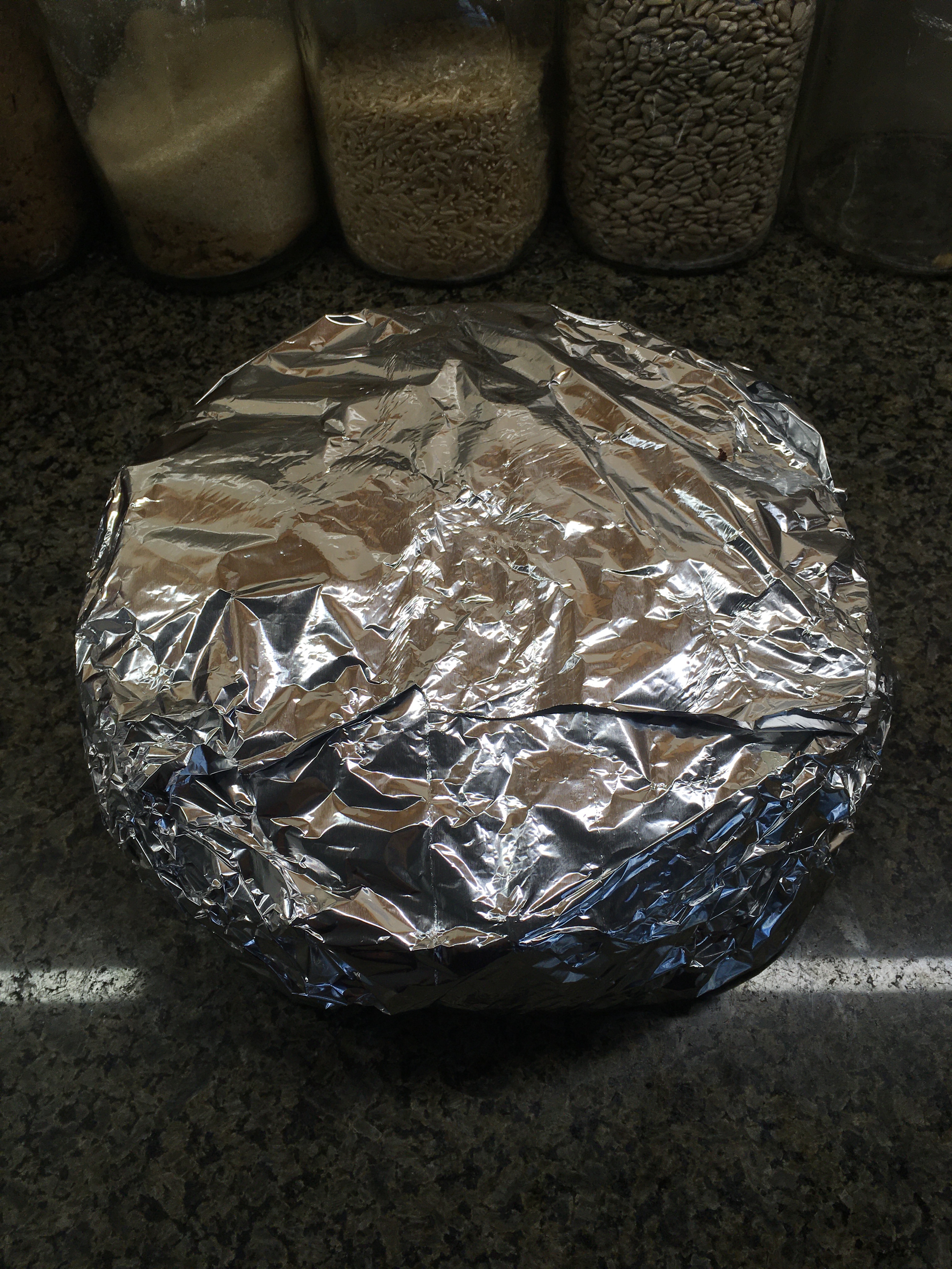 Spoon into the prepared cake tin and place a double layer of foil on top.
