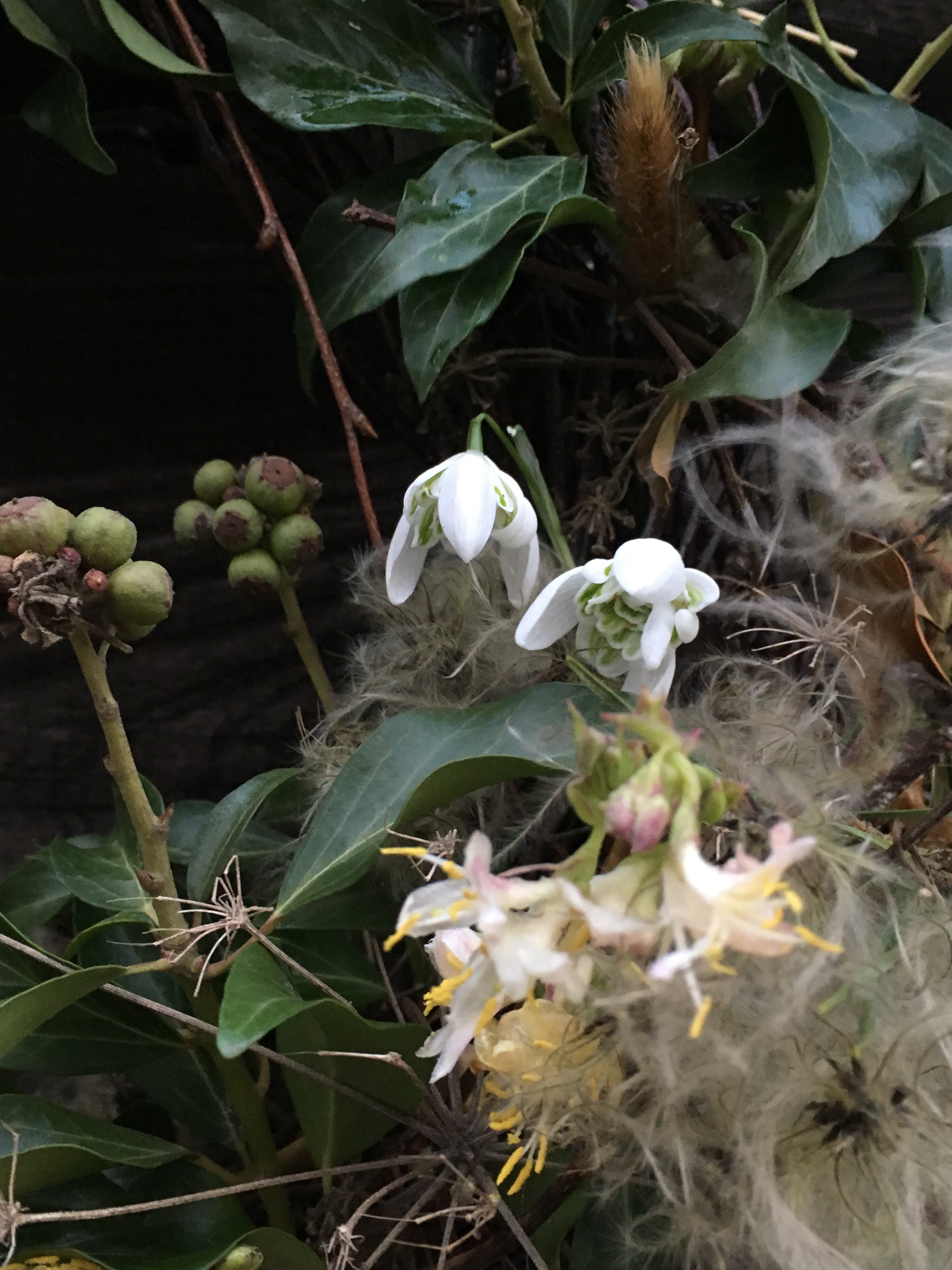 Here’s a view of the garden today. The hawthorn hedge looks like seafoam in the wind. Looks like there will be more rain, judging by the colour of that sky.