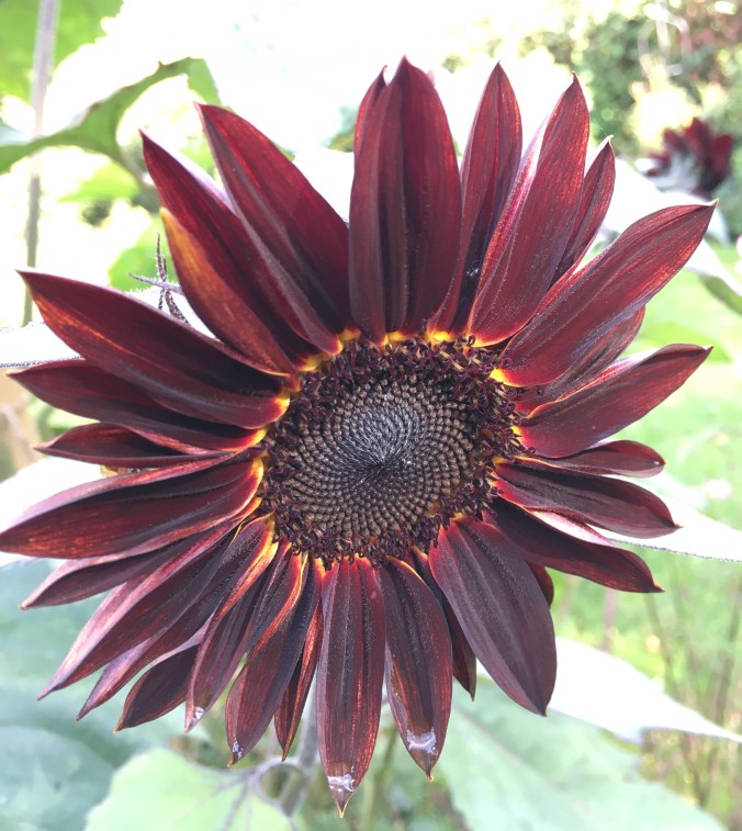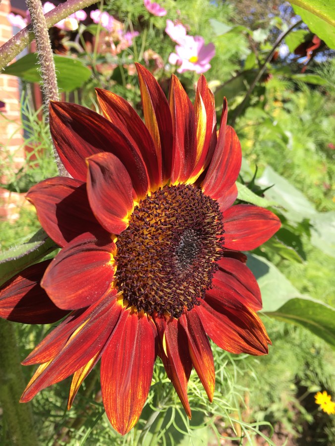 Now for the ‘blue’ photos this week. I’ve chosen morning glory, Ipomoea purpurea. This is a seedling from a selection I’ve grown for years. Morning glory is an annual climber reaching 4-5m given a warm sunny fence or wall. Mine grow up through my climbing French beans. I’m hoping the flowers will attract pollinators which will benefit my vegetables. You can see the nectar guides in this photo. Flowers have visible and UV guides or lines directing bees to the nectary. Sunshine has highlighted the lines. It’s almost mesmerising. I save my seed each summer and store it in a cool, dark place over winter. I’ll start them off again in 3″ pots on the kitchen windowsill in February. Recommended varieties include Star of Yelta, Grandpa Ott and Heavenly Blue. All easy to grow, and once you’ve bought a packet of seed, you’ll have morning glory for ever more. Such a lovely thought!