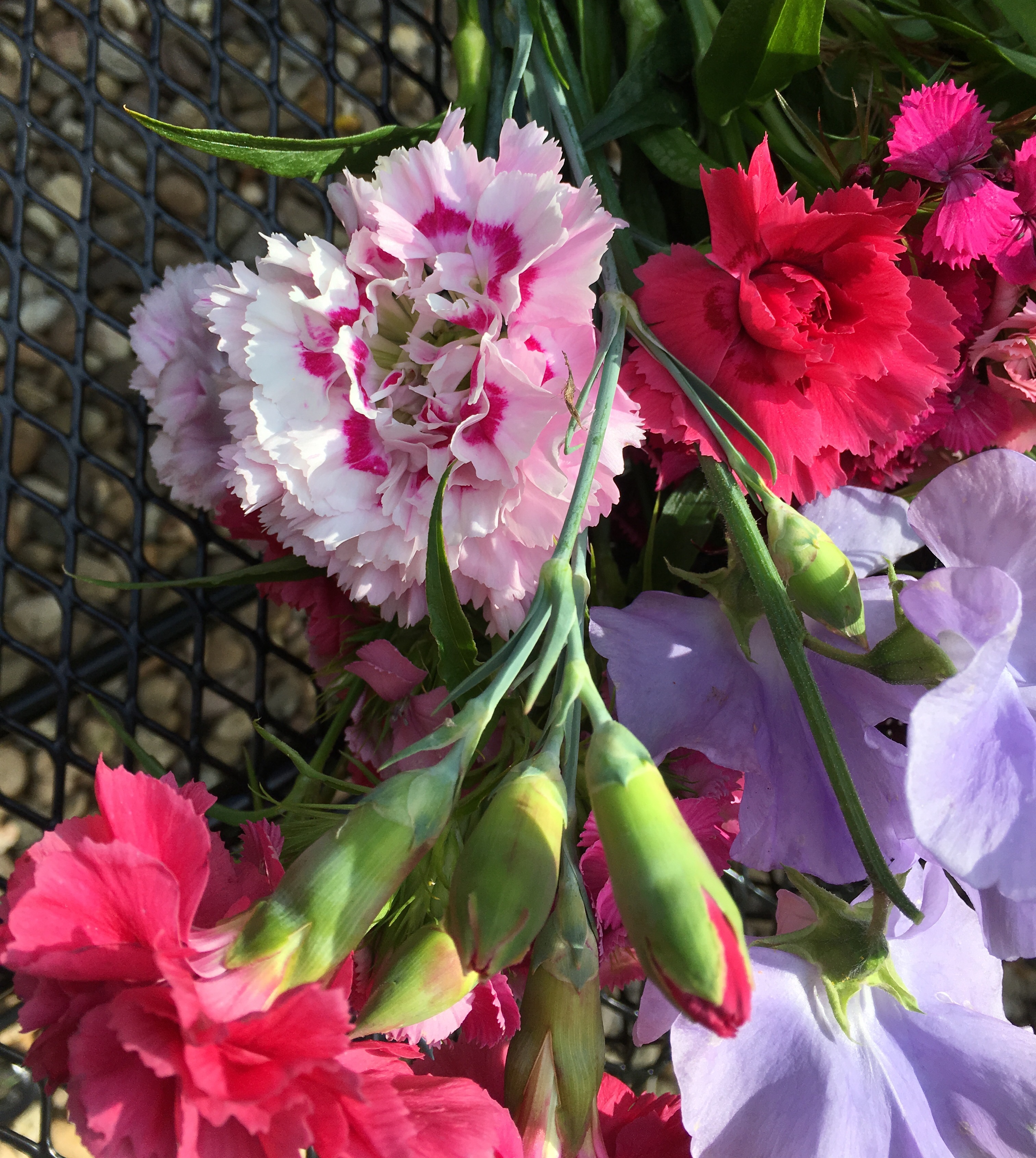 Don’t forget that cow parsley can be used even when the flowers are going over. The little lime green seed heads are still attractive. I also use seed heads of parsnip, onion, carrot, chives, mustard and leeks. I found out by accident by leaving some vegetables to go to seed. I now leave them on purpose to supply free seed heads for floristry. Fluffy clematis seeds are also saved for winter decorations.