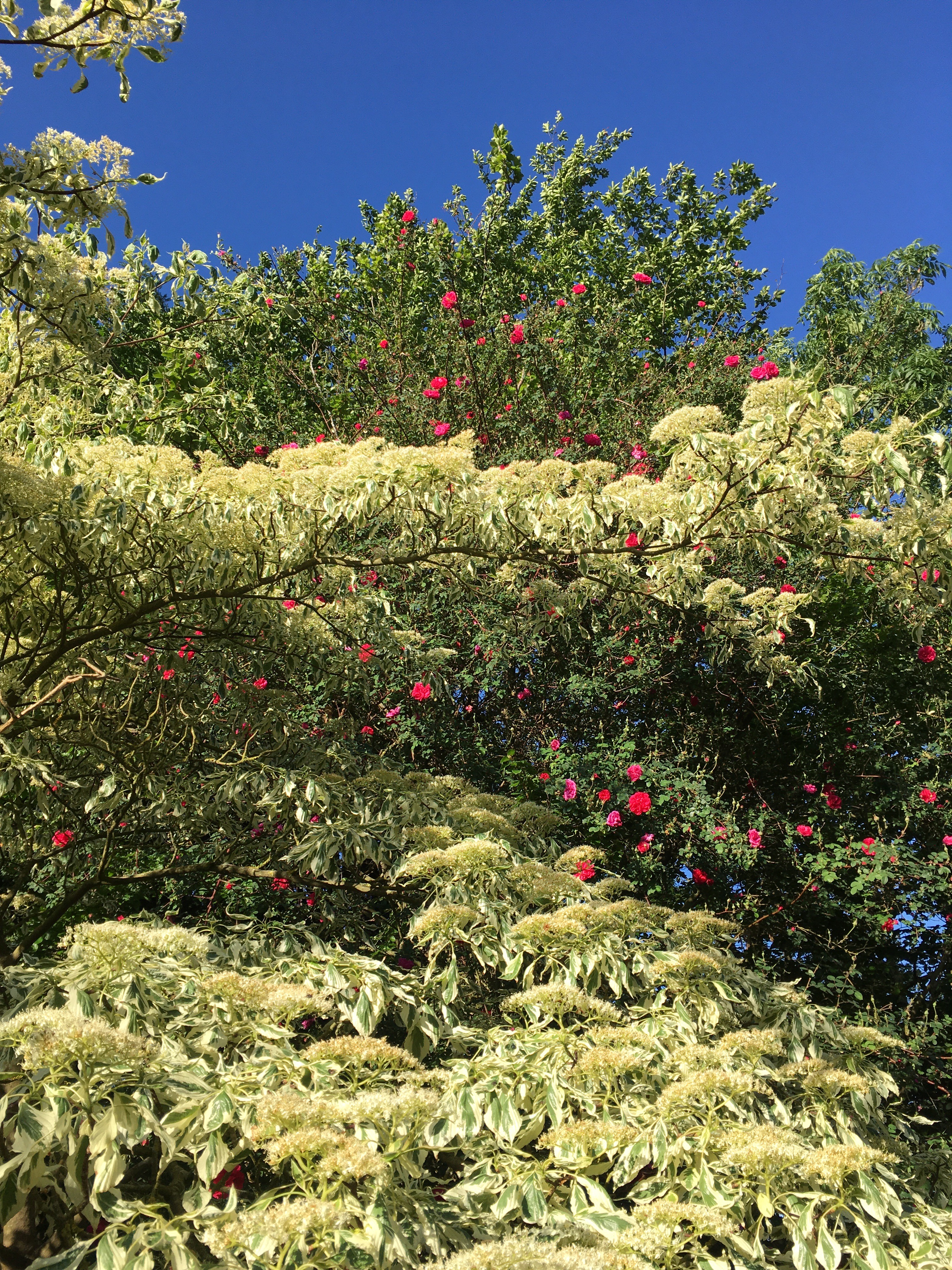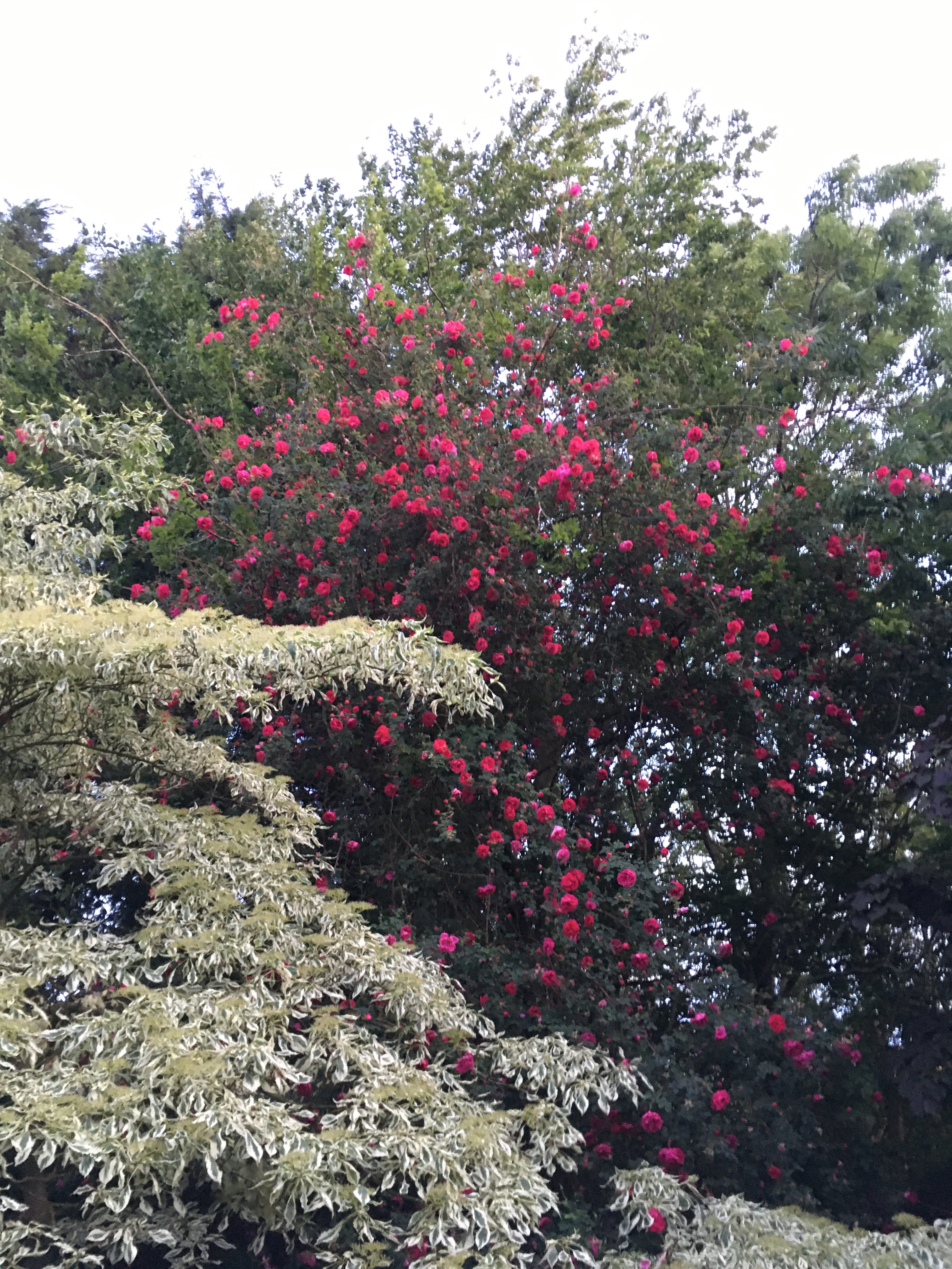 Common honeysuckle, Lonicera periclymenum caprifoliaceae. I recommend Jekka’s Herbs for plants. Wonderful scent and beautiful red berries. Plant with the roots in the shade and it will climb to reach the sun. If you plant the roots in the sun, the plant often succumbs to mildew and aphids. It is a woodland plant, essentially. Its habit is to climb and then flop down. In nature you often see plants dangling from high up in trees. So it is not ideal to try to control it and plant it over an arch or on a trellis. It will always want to go skywards. It wants to use other trees and shrubs as a climbing frame. Be careful when buying honeysuckle as some varieties do not have any scent, which is such a disappointment if you’ve waited several years for the plant to flower!