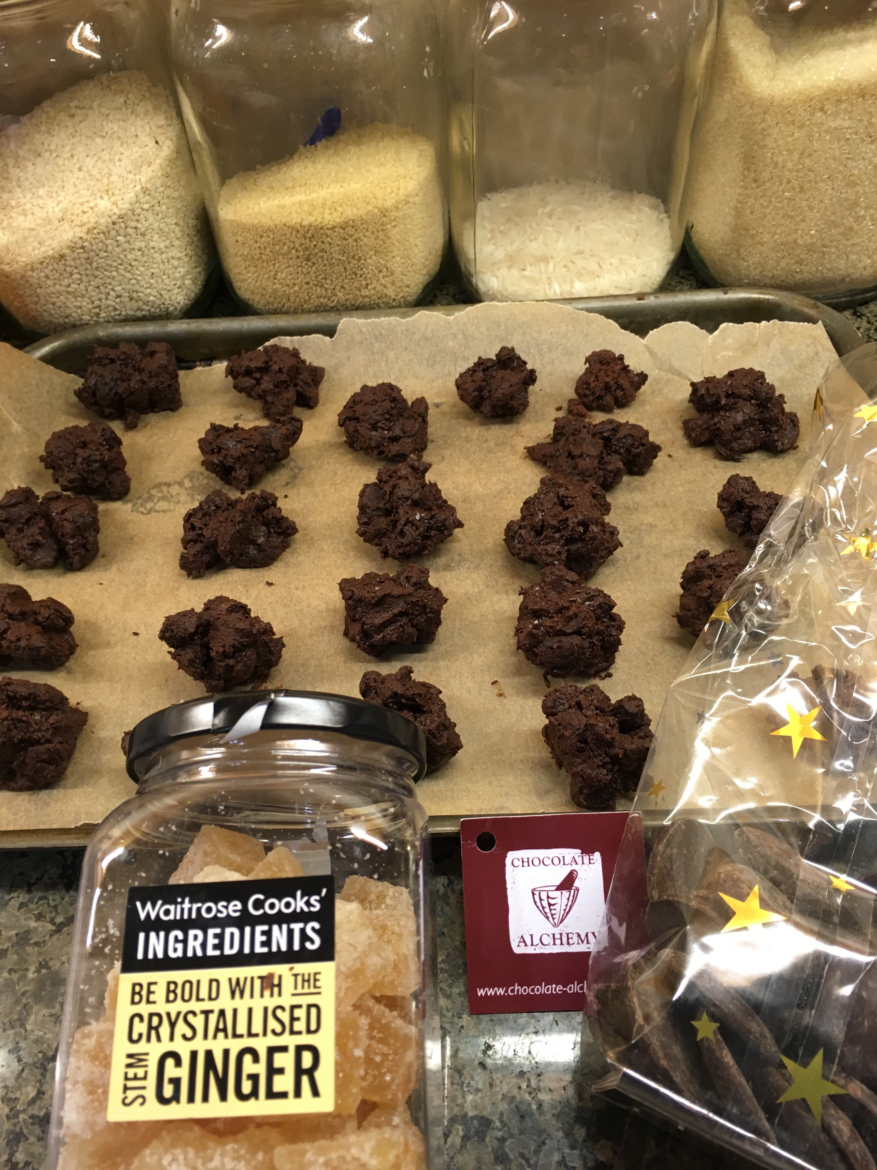 I’ve used Waitrose crystallised ginger and chocolate buttons from http://www.chocolate-alchemy.co.uk/ . These are very gingery. Adjust the amount of ginger to taste.
