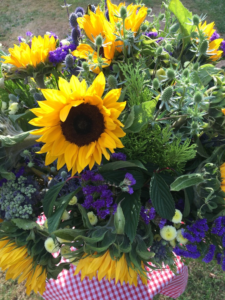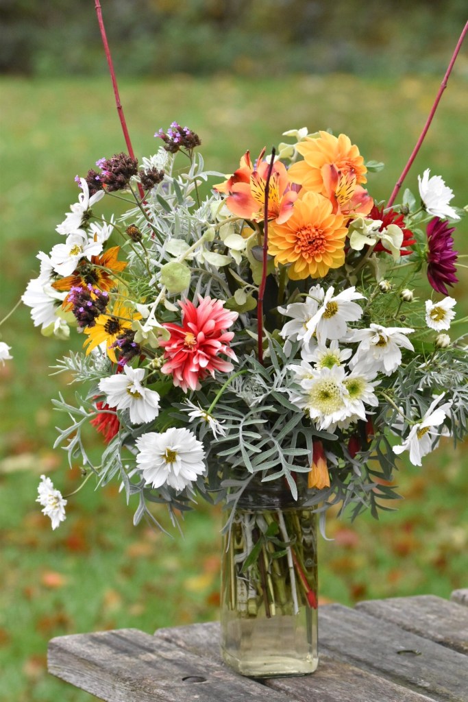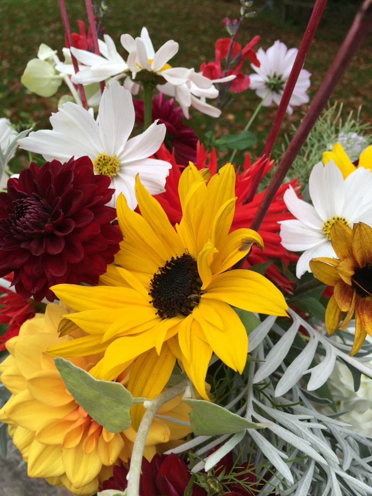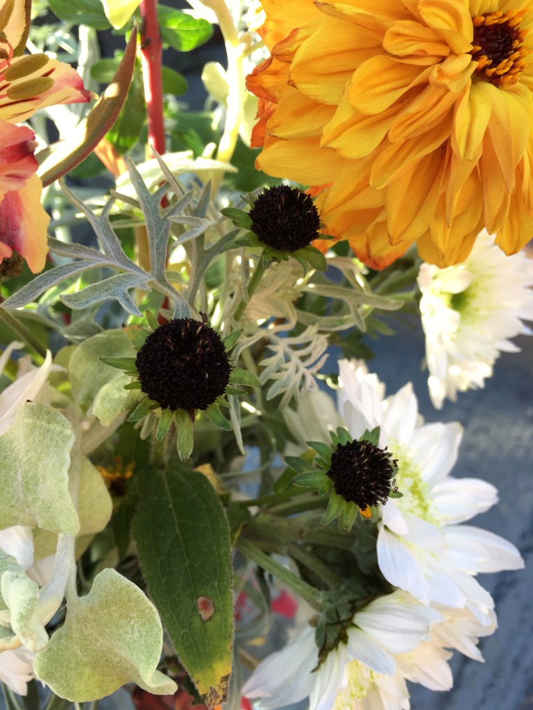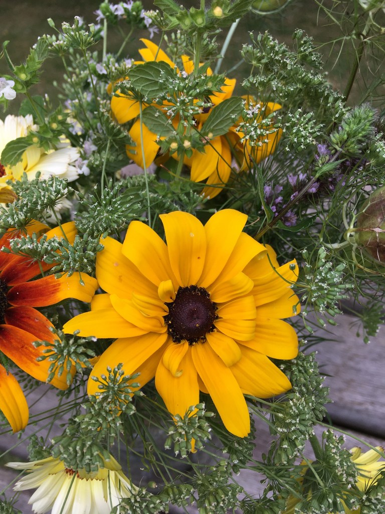 Rudbeckias, calendula and green seed heads from Ammi majus