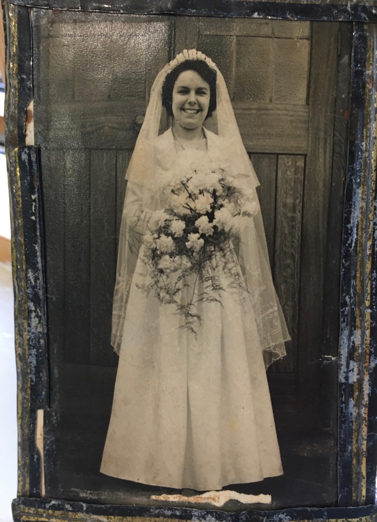 A photo of Joan on her wedding day carrying a bouquet of carnations and asparagus fern. The photo is in a metal Players cigarette box frame my father-in-law made to protect the picture while he carried it around during National Service in Korea in the 1950s. He didn’t smoke, I hasten to add, but he was good at recycling and ‘making-do’ all through his life.