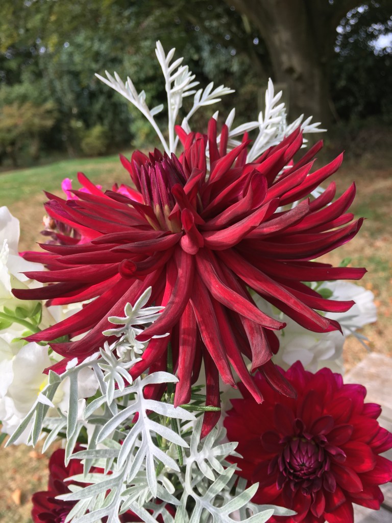 I chose bright red dahlias as Joan’s husband used to grow these for flower shows and at one time almost all the back garden was given over to straight rows of dahlias and chrysanthemums.