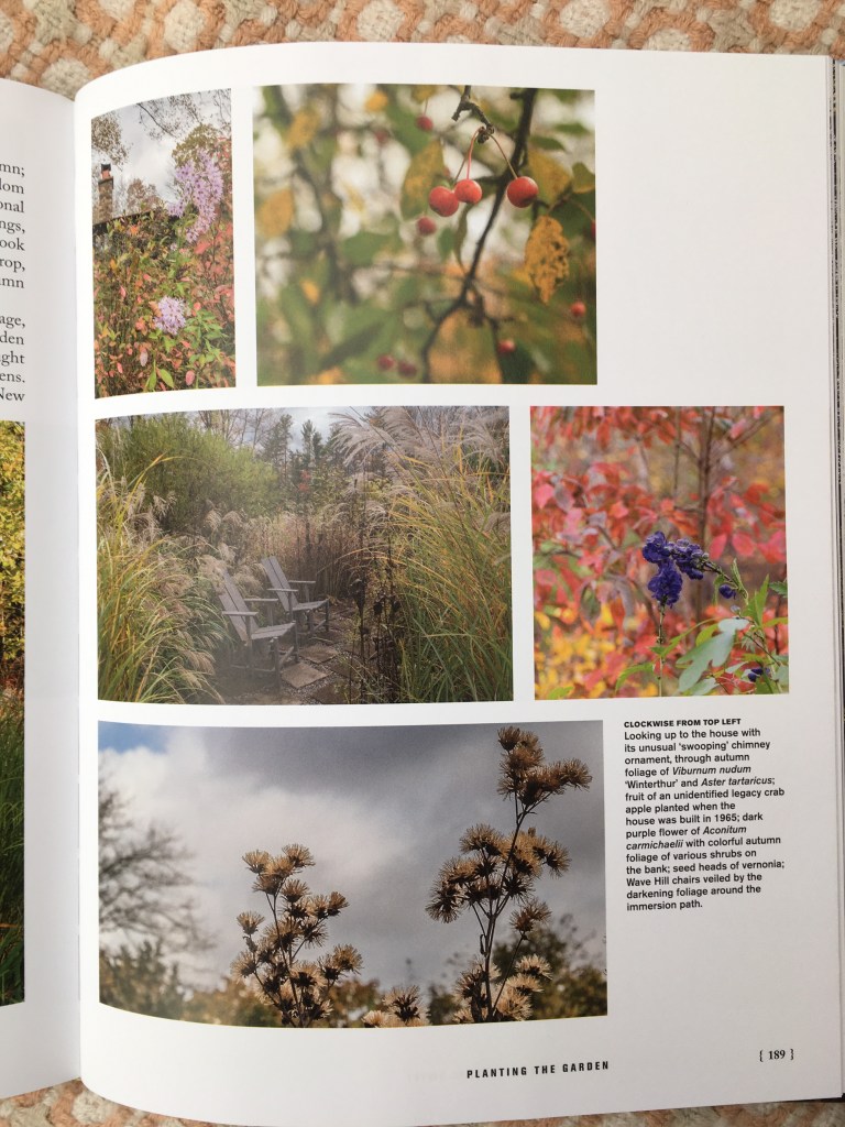 A view of garden taken from a drone. The stone circle is the largest structure in the garden. It’s made of a hard local mudstone called argillite ( ‘blue jingle’ in the local argot, because the stones ring when hit together) that is ubiquitous in this area. Here the circle is like a plant dam, preventing spillover of the prairie into one of the few open spaces in the garden. Like the rest of the garden, James says, it has no utility. It exists to add visual weight, atmosphere and to serve as a stopping place, perhaps to “sit, observe, or let your mind wander.” James writes: “Further along the terrace, towards its sunny eastern end, this small rectangular reflecting pool makes an elegant contrast with the surrounding naturalistic plantings. The juxtaposition of the sharply defined pool, the repeated domes of miscanthus, and the flowing vegetation give this part of the garden a ‘designed’ look not typical of the garden as a whole.” Views through the seasons Planting the garden. Clockwise from top: Hosta sieboldiana, Iris virginica ‘Contrabrand Girl’ Cephalanthus occidentalis, the canal pond, the bare garden in spring after cutting back, Euphorbia palustris, Dryopteris erythrosora, Maianthemum racemosum – about to flower. The garden in winter. A clearing in the woods. The Federal Twist road is not well-known. It’s hidden in the woods above the Delaware and is only four miles long. James says “I accepted a very ungarden-like place as my garden destiny.” The book is dedicated to Philip. Front cover