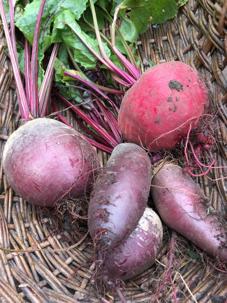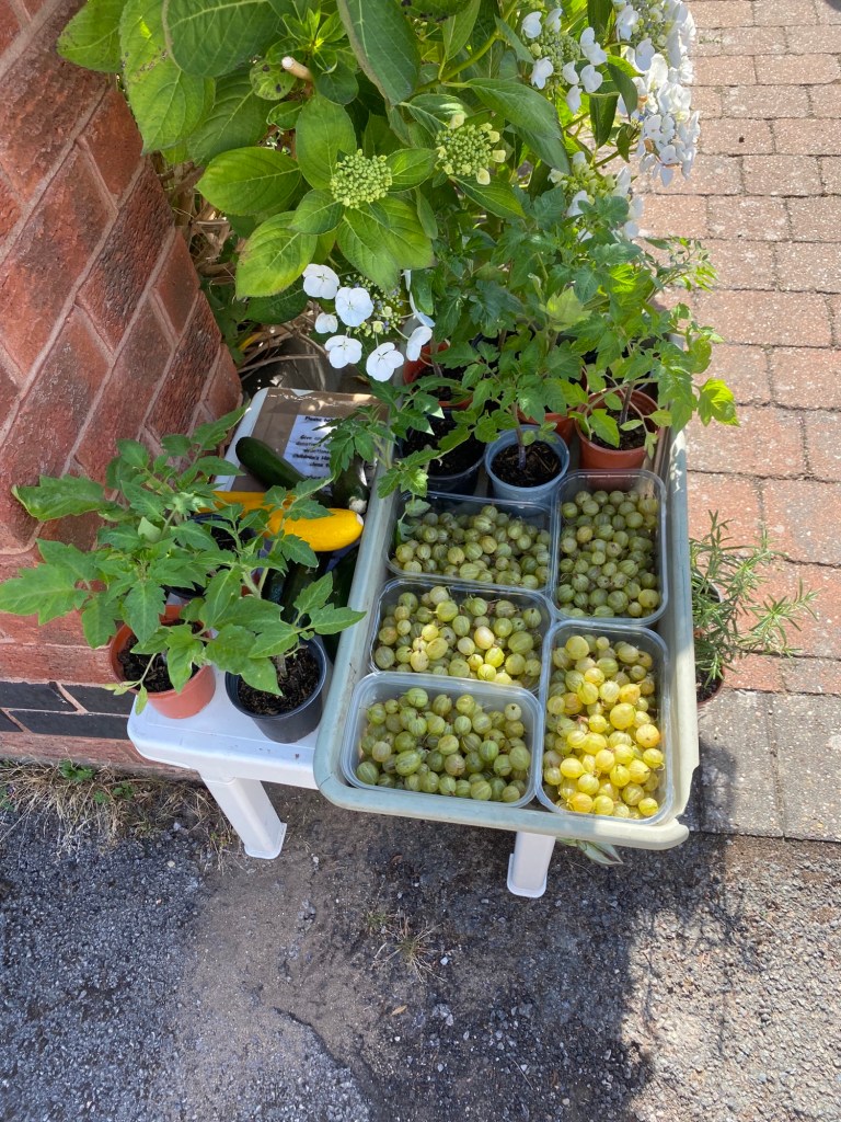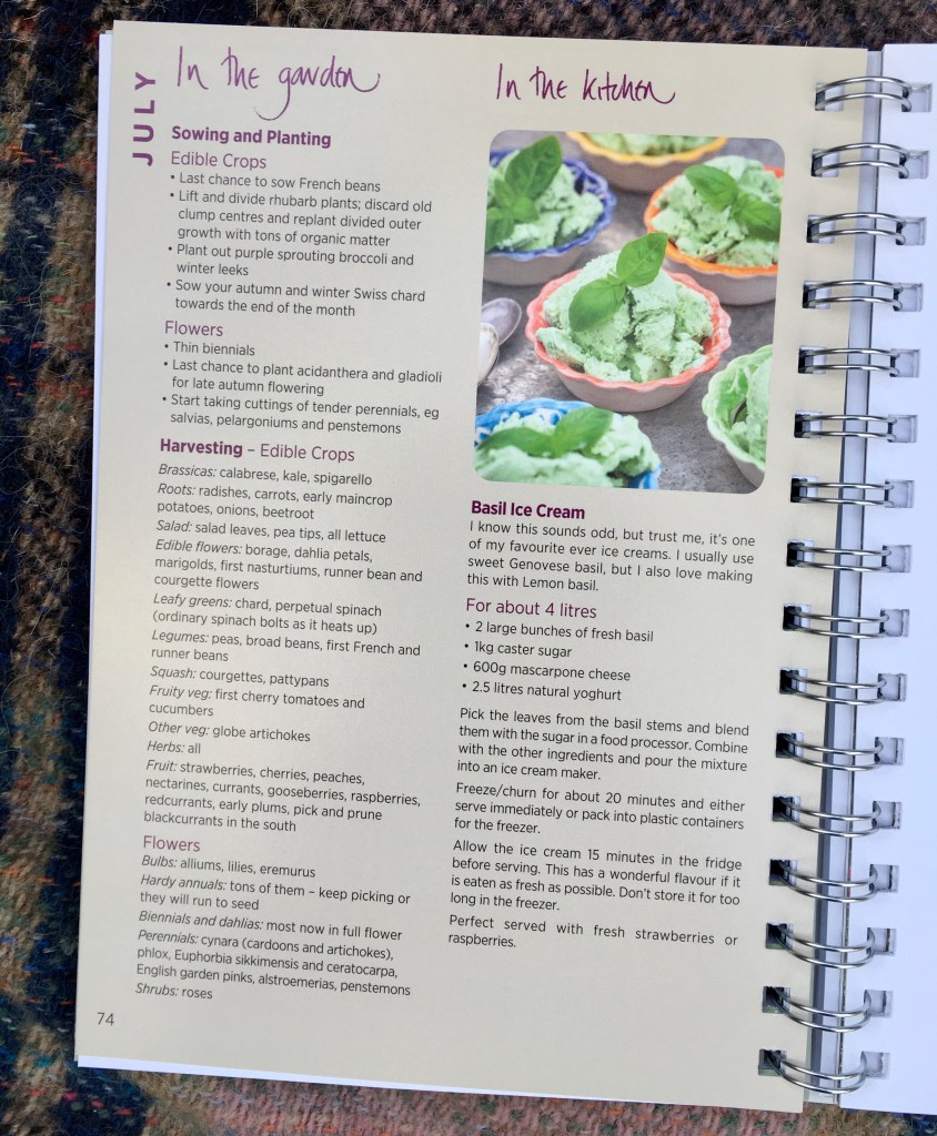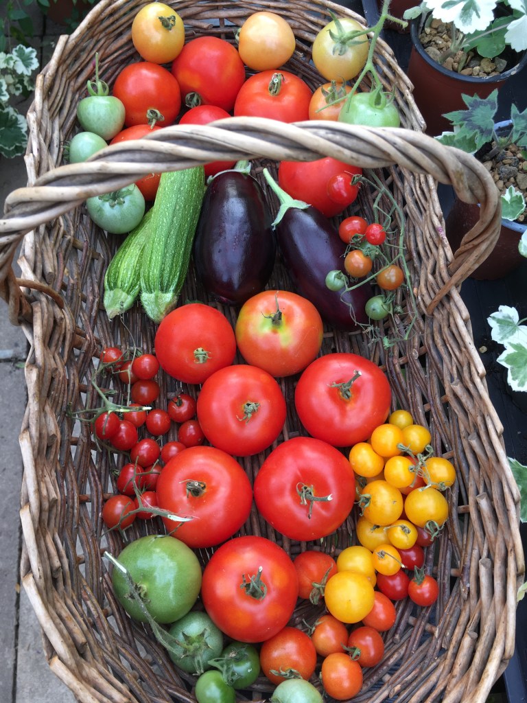 Fruit and vegetables have grown well this year. In my basket there’s white-stem chard, perpetual spinach, herbs, white-flowered runner bean variety ‘Moonlight’ onions, tomatoes Blaby, Marmande and cherry types. There’s been a steady flow of blueberries from the plot. Ivanhoe is growing in a large 40cm diameter pot.