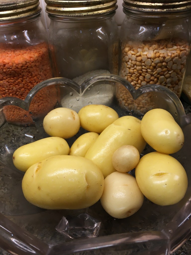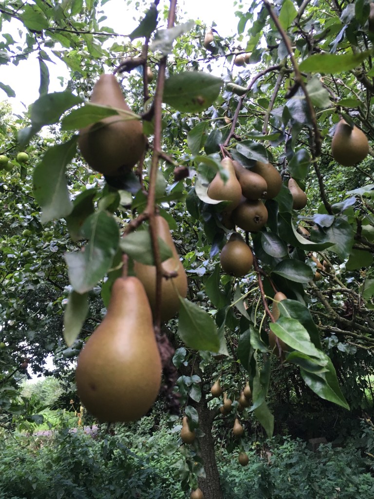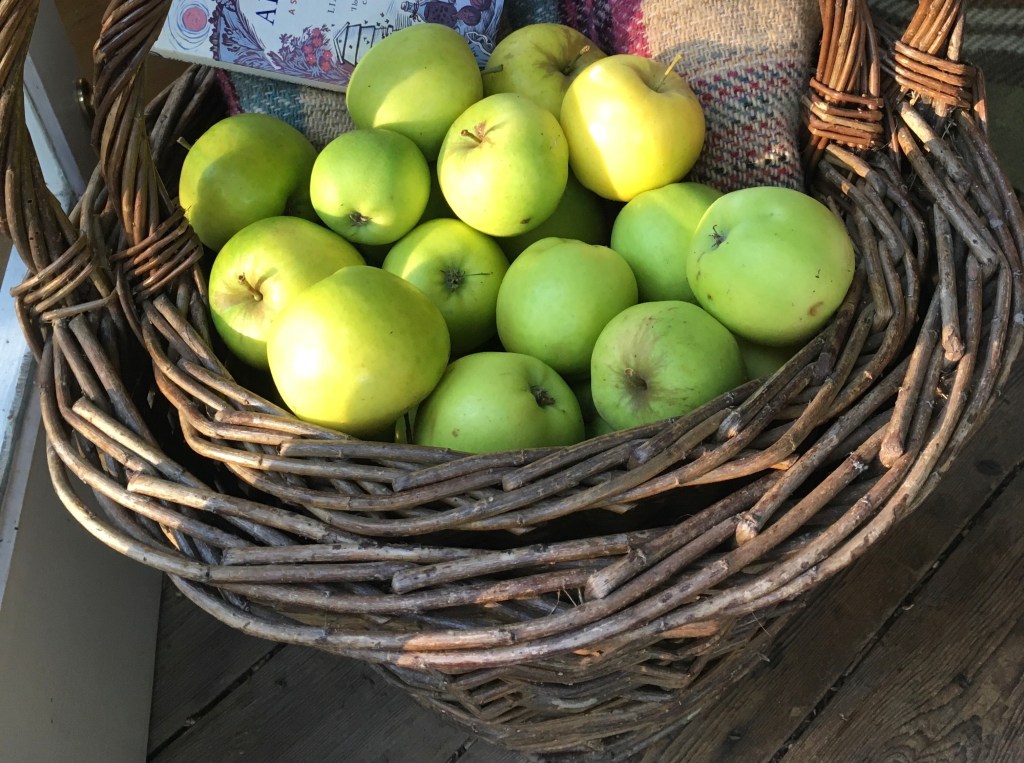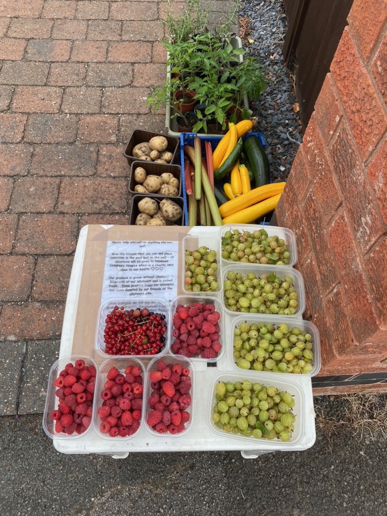 Fruit and vegetables have grown well this year. In my basket there’s white-stem chard, perpetual spinach, herbs, white-flowered runner bean variety ‘Moonlight’ onions, tomatoes Blaby, Marmande and cherry types. There’s been a steady flow of blueberries from the plot. Ivanhoe is growing in a large 40cm diameter pot.