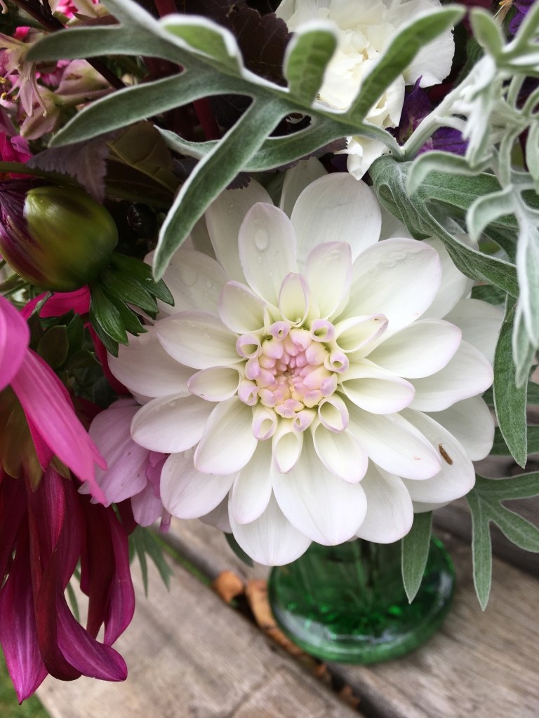 Nuit D’Ete is a lovely cactus-type dahlia. Dahlias, cosmos and dogwood. Senecio Vira Vira is from Coton Manor nursery. Protect dahlias from earwigs. Add pots of straw or newspaper to the top of canes. Tip them out each morning. Dahlia cuttings.Today’s bouquet.