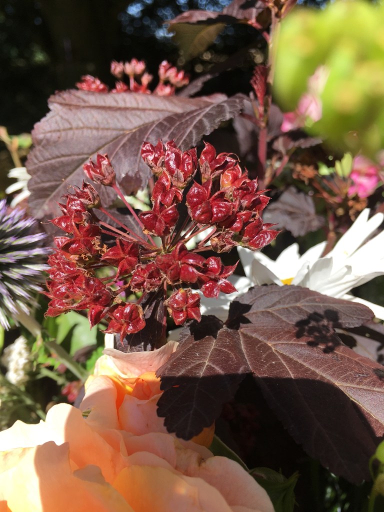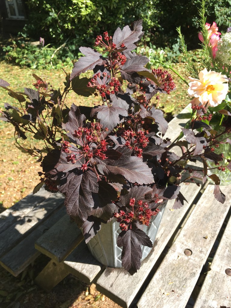 A beautiful backbone shrub, growing to 8ft. Comes into leaf early in spring. Produces pretty pinkish white flowers. Flowers then produce interesting seed heads. good strong stems for floristry and a lovely dark colour to set off all flower colours. I grow mine on a north-facing border directly in front of a hawthorn hedge. Copes with dry soil and semi-shade.
