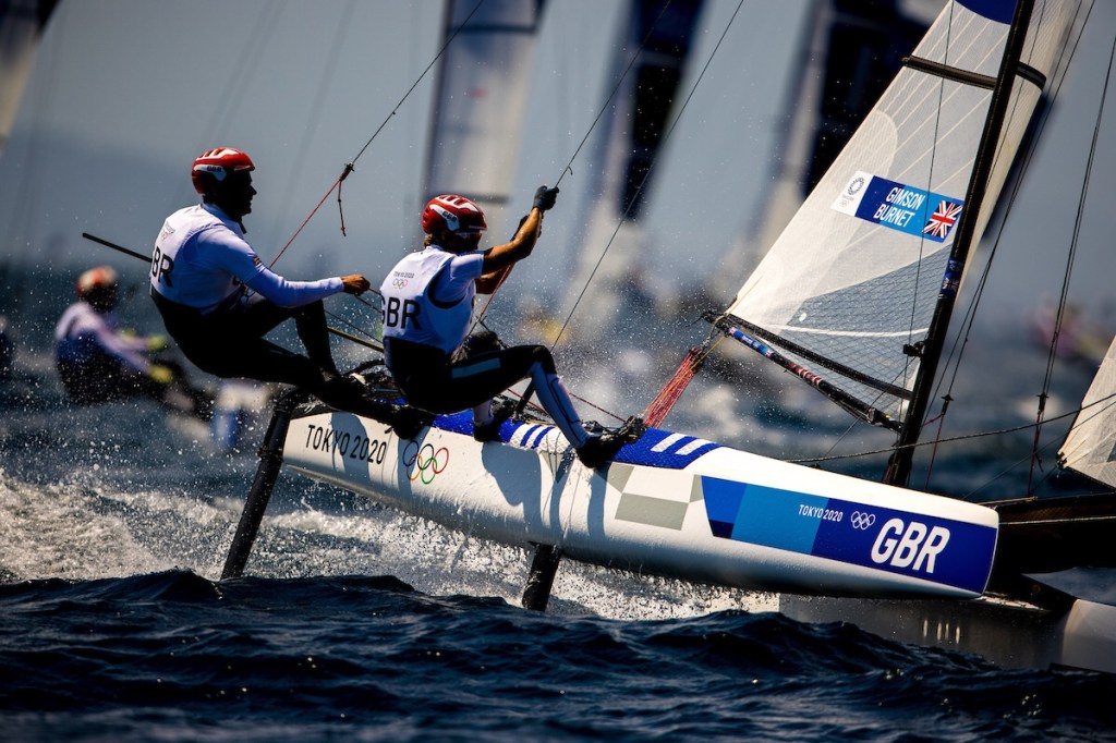 Here he is, with team mate Anna Burnet, flying the flag in the Olympic mixed multihull Nacra 17 class.