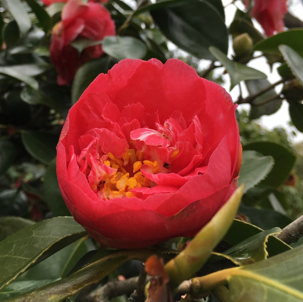 Viburnum Eve Price flowers all winter. It has evergreen leaves and is tough and hardy.