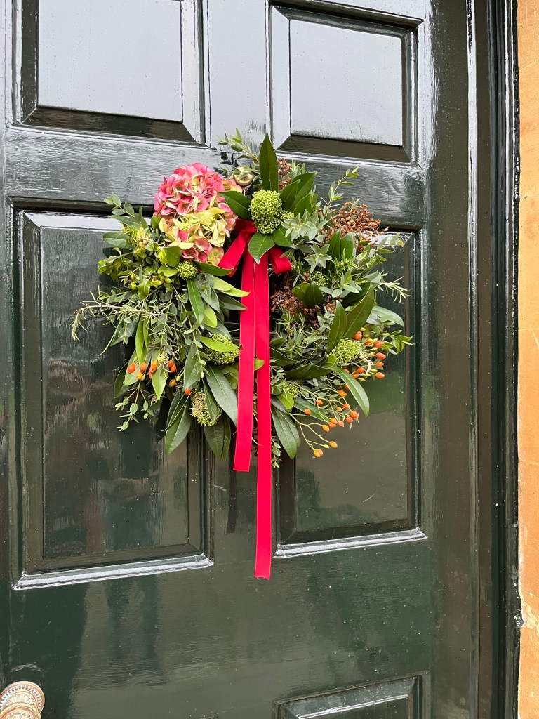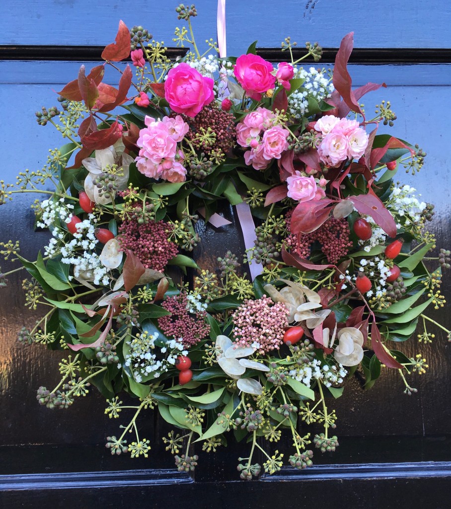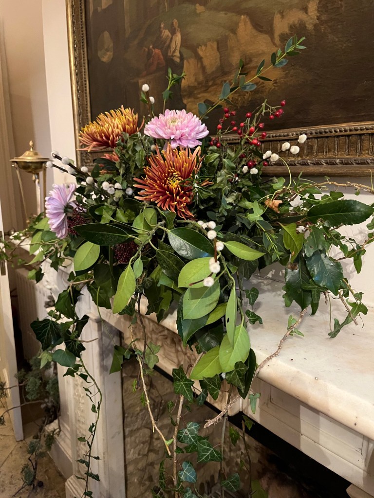 The pink flat heads are viburnum Eve Price. Surrounded by ivy, gypsophila, rosehips. Euonymus, and Rosa The Fairy.