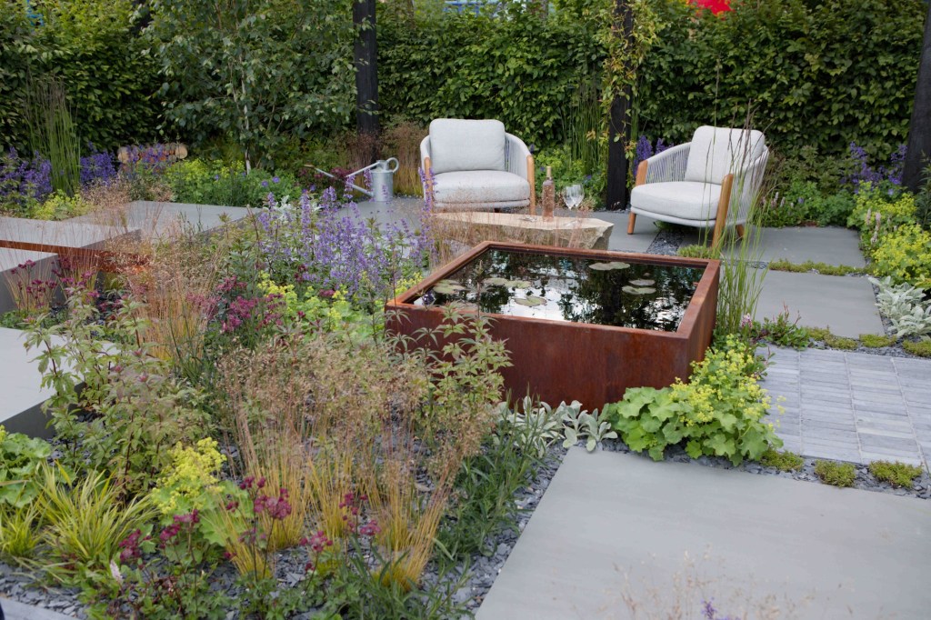 A contemporary garden. A rill water garden. A garden with en elevated seating area.