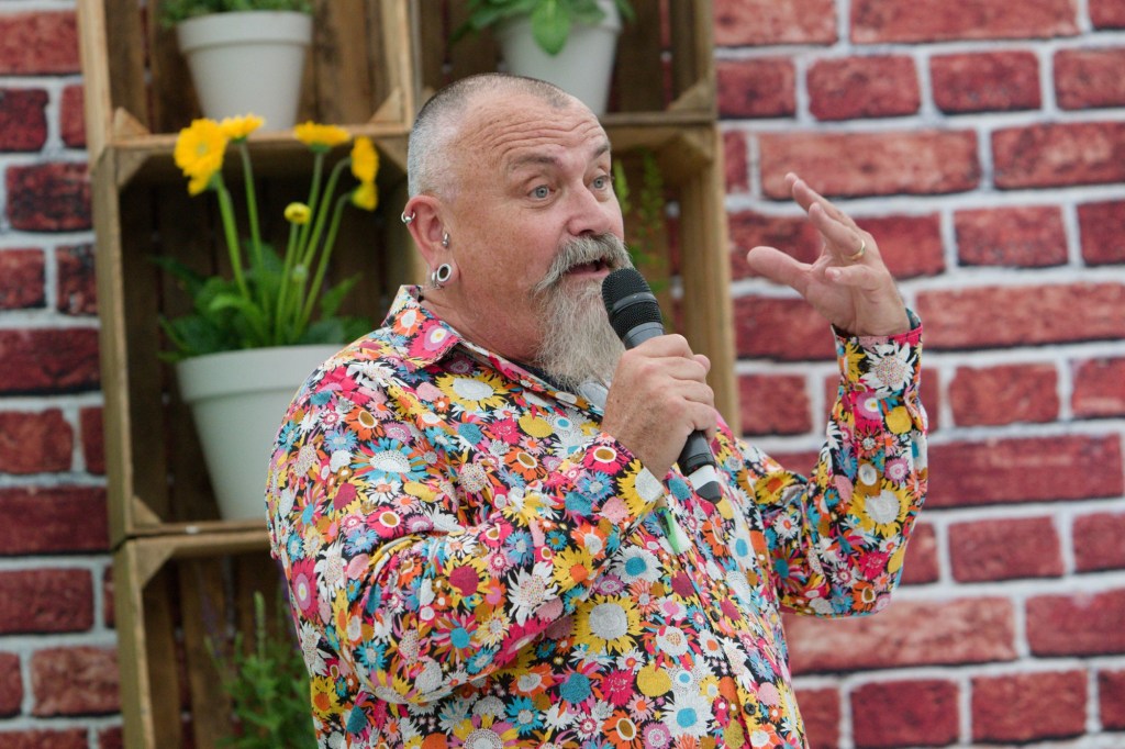 Frances Tophill presenting from one of the show gardens. Bug and butterfly hotels feature in this show garden at GW Live.