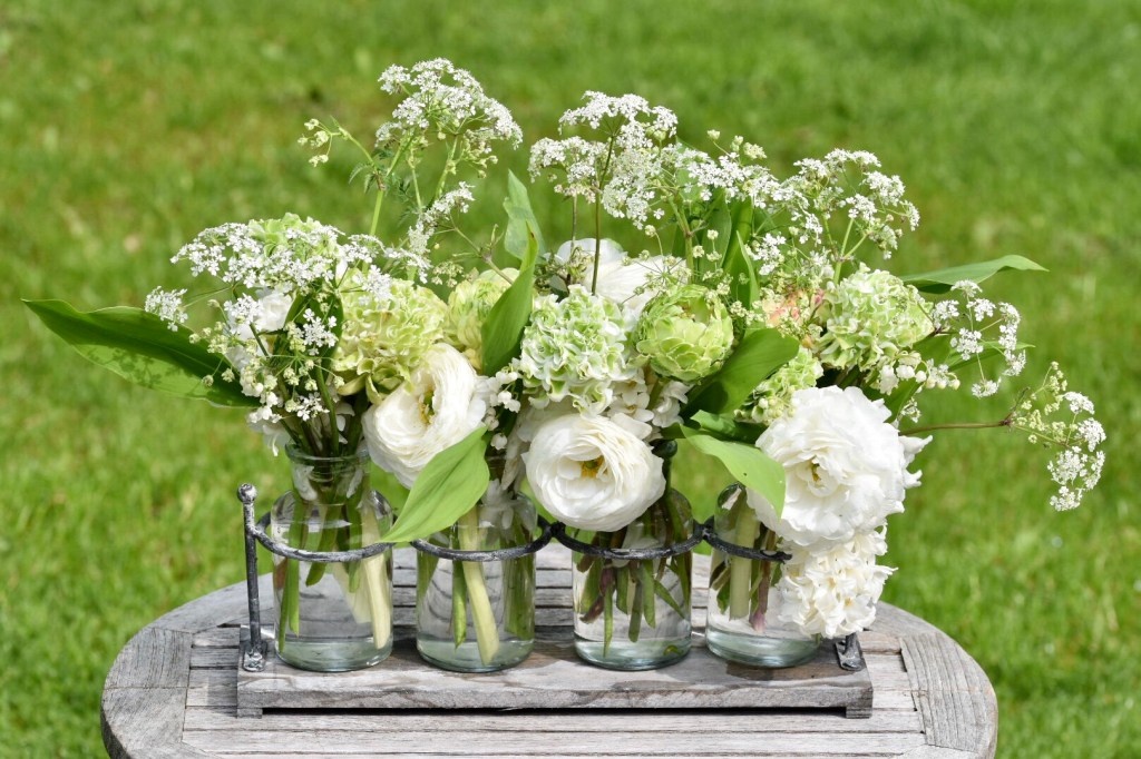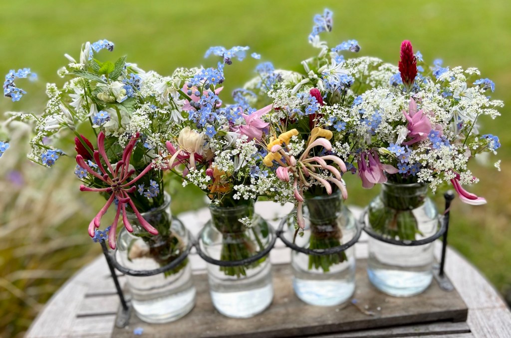My stand came from Jonathan Moseley. He sells floristry materials, flower cutting snips and vases at various flower shows all over the country. He also has an online shop. I use this stand every day and place it down the centre of the kitchen table. Vases can also be arranged in a circle with a pillar candle in the centre. I have created mini posies for this photo, but equally you can just pick a few stems and place them directly in the jam jars and they look ‘arranged.’
