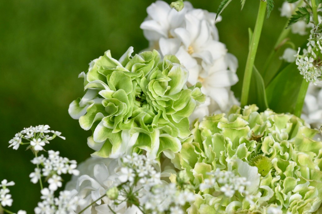 Don’t forget that cow parsley can be used even when the flowers are going over. The little lime green seed heads are still attractive. I also use seed heads of parsnip, onion, carrot, chives, mustard and leeks. I found out by accident by leaving some vegetables to go to seed. I now leave them on purpose to supply free seed heads for floristry. Fluffy clematis seeds are also saved for winter decorations.