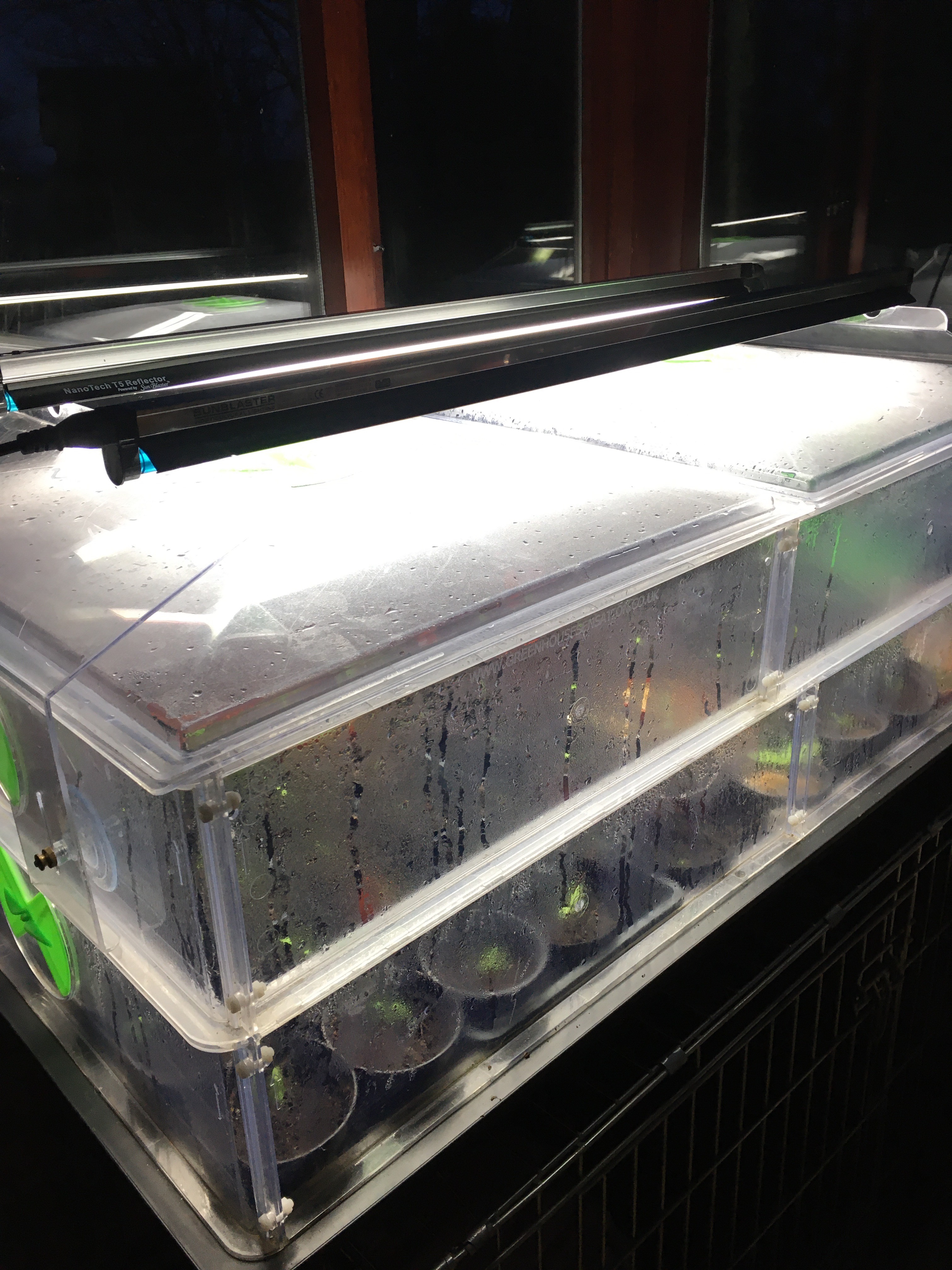 Seedlings in the greenhouse, tomatoes, cosmos, onions, cucumbers, aubergines, peppers.