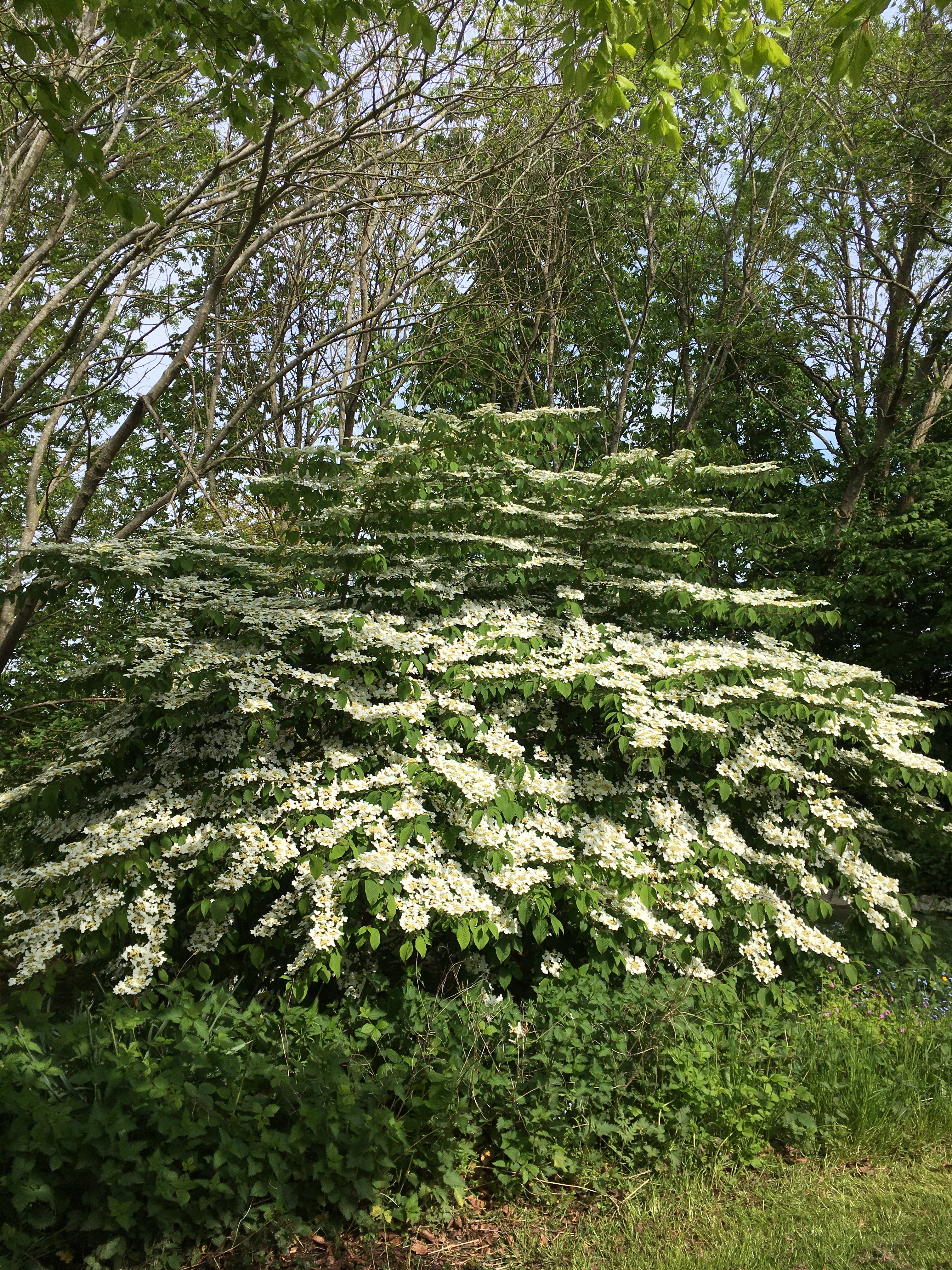 The whole garden is scented by this viburnum. Planted in front of white cherry tree, prunus avium, and pink cherry Prunus Kanzan.