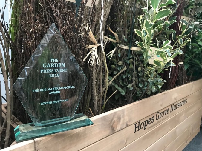 Hopes Grove won the Bob Maker Memorial Award for the best stand at the trade fair, the Garden Press Event in London.