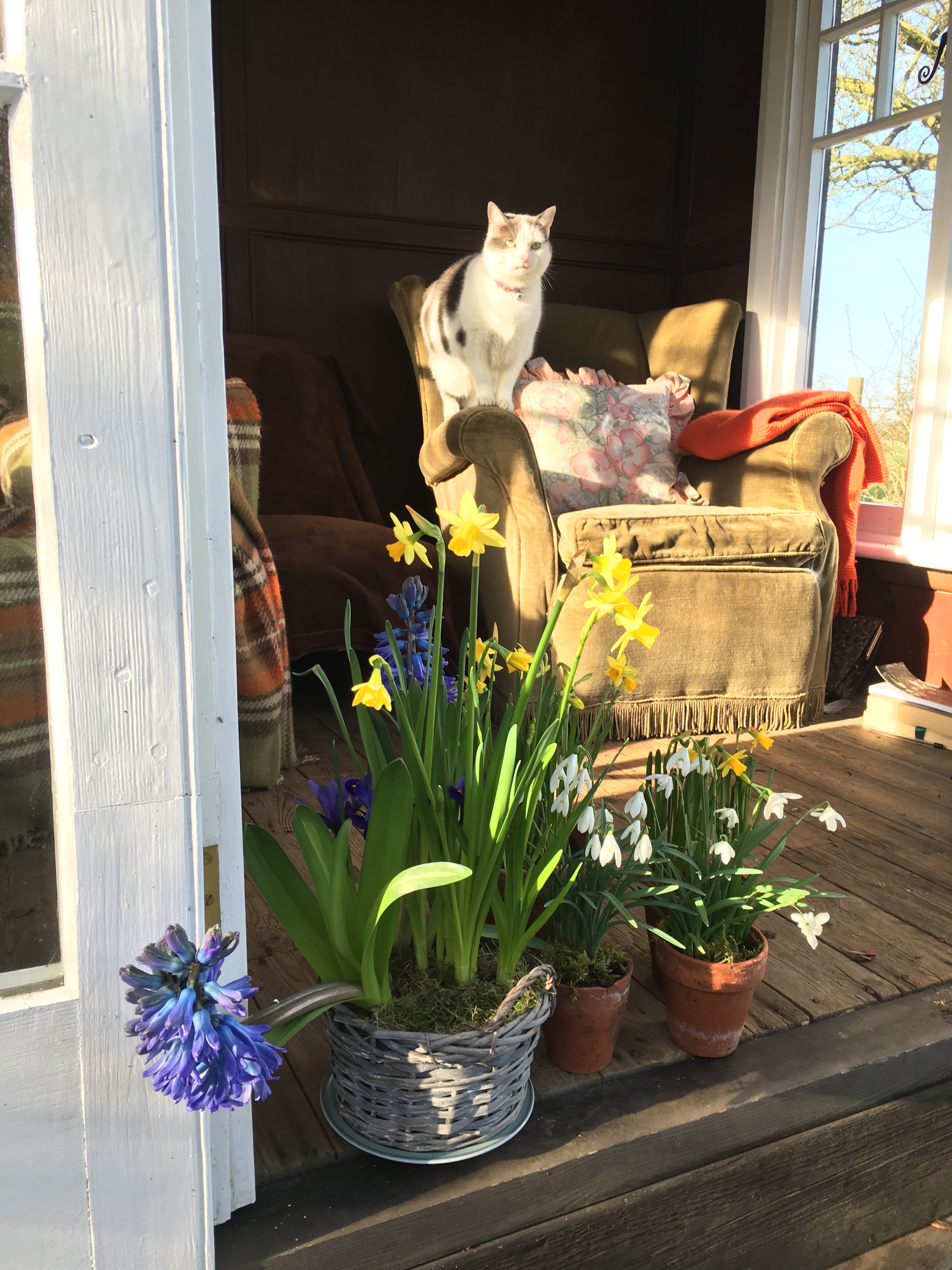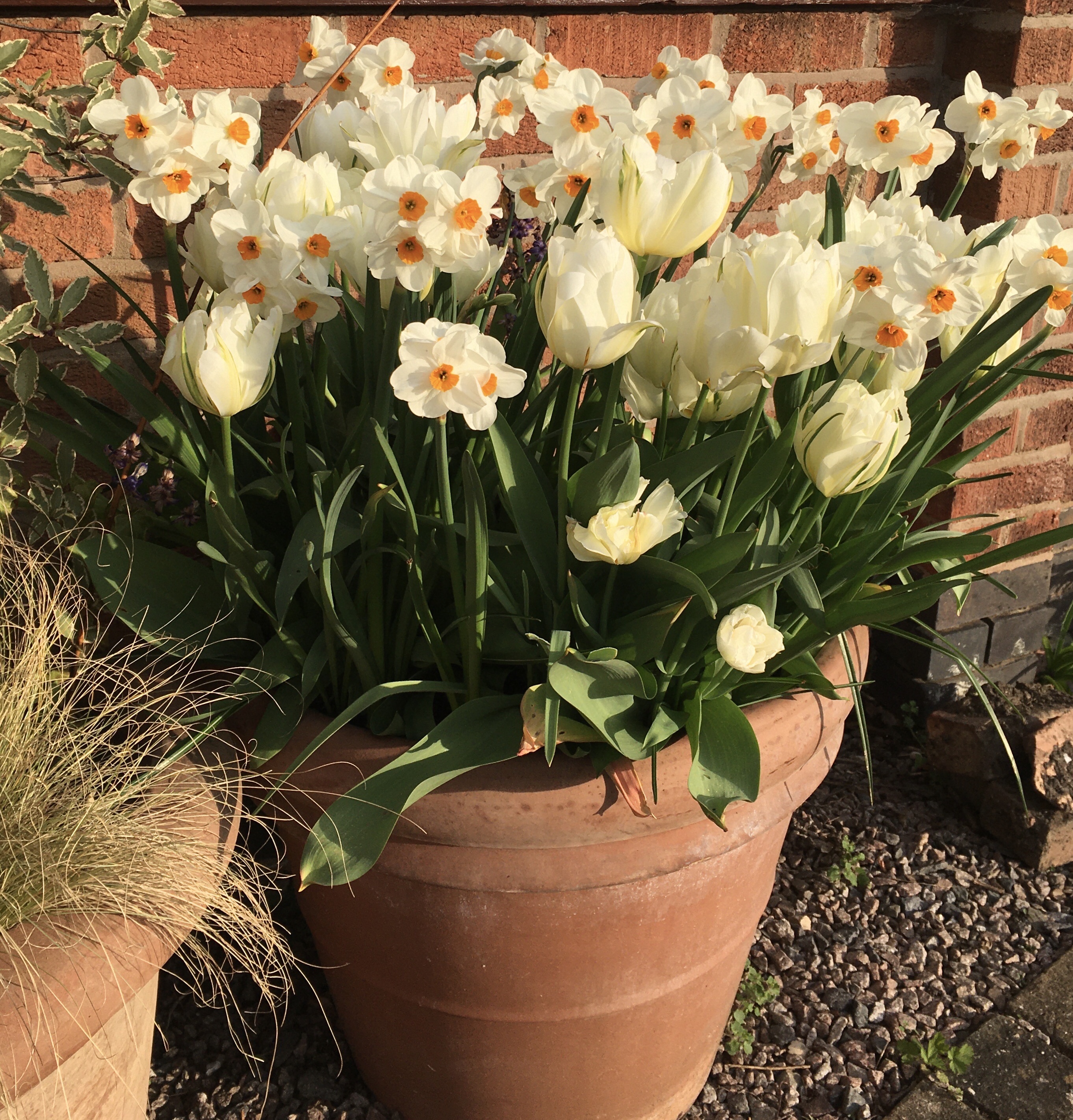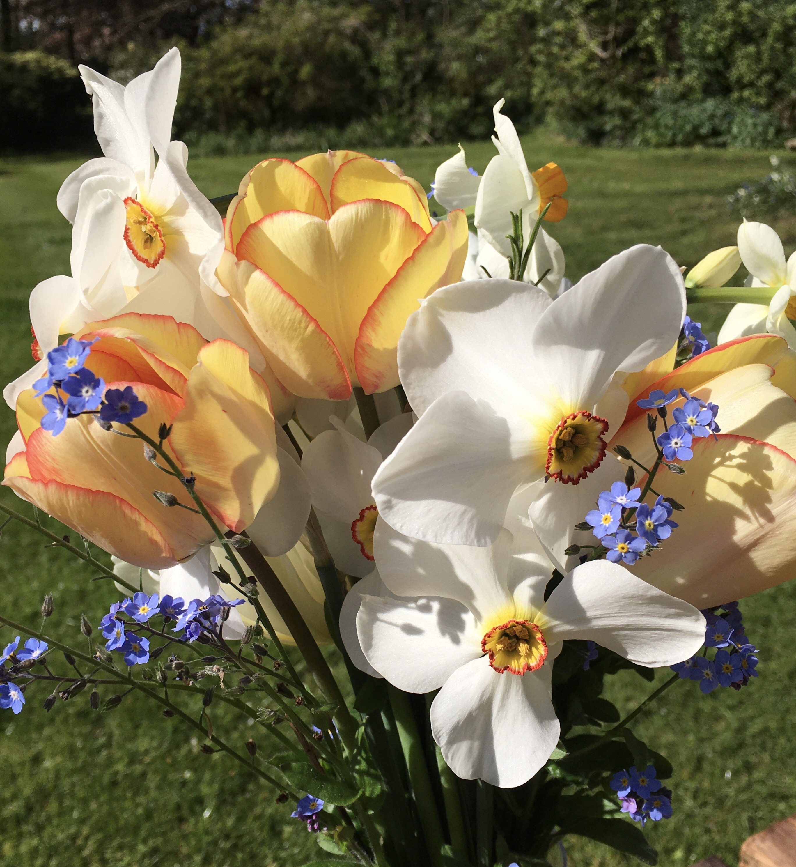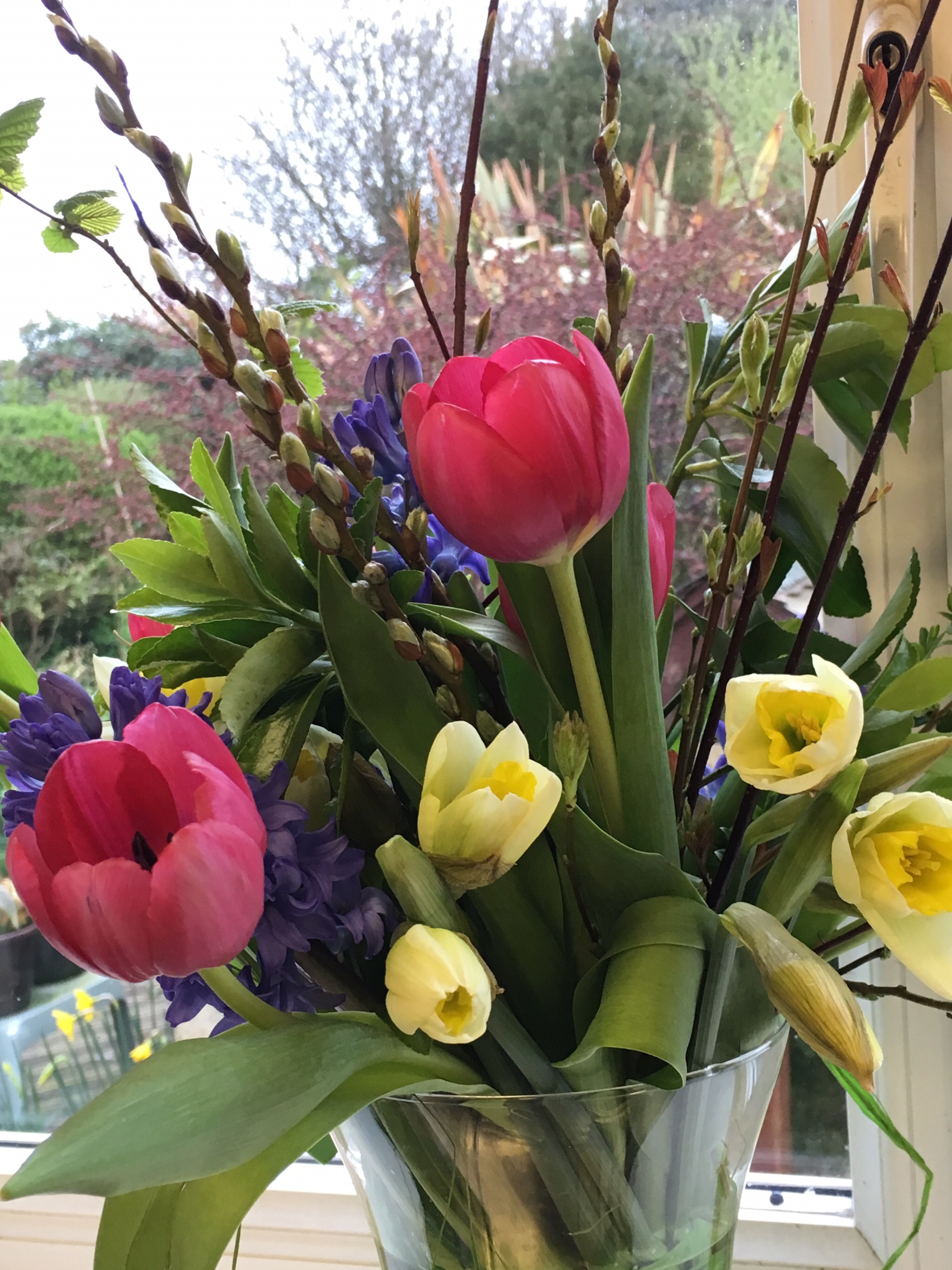My cut flower tulips are in bud. Tulips in the sunny front garden are already flowering early. I’ll cut a huge bunch of daffodils and tulips for the front windows. Vases of flowers will cheer up anyone passing by, even though they can’t call in to visit.