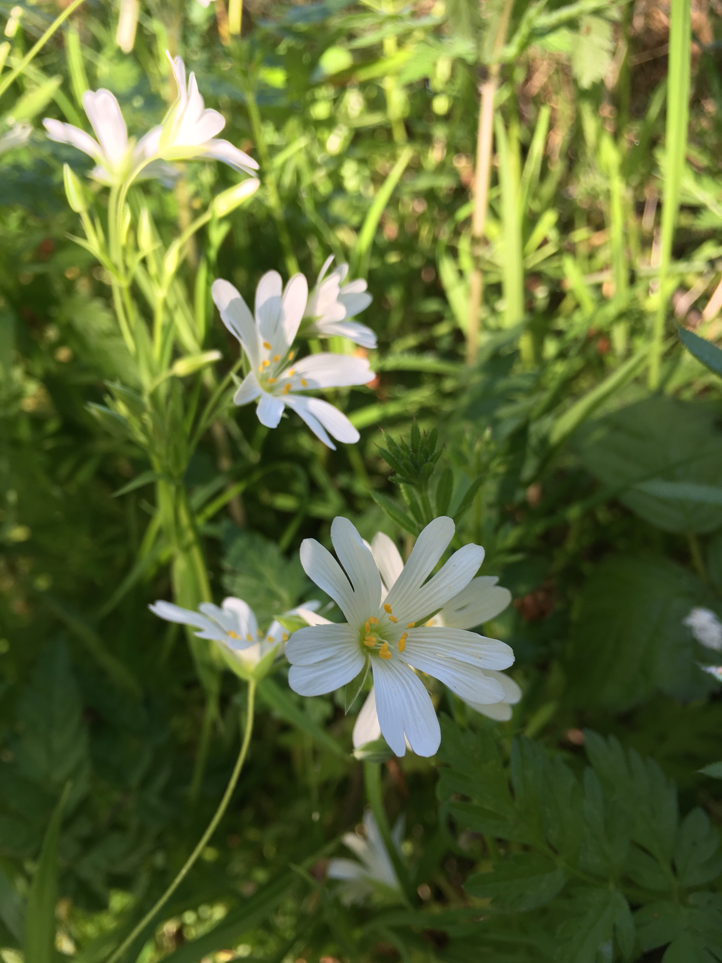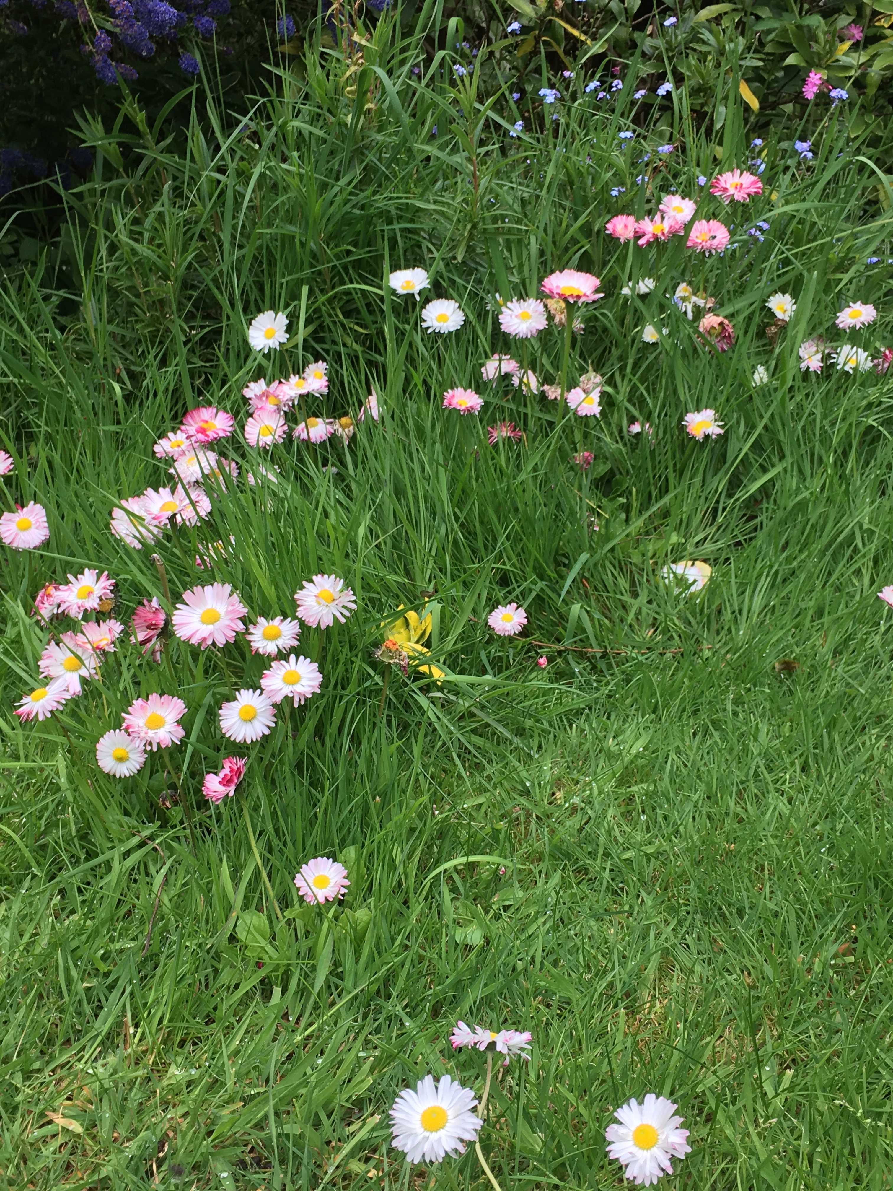 I have a bed 3m long by 1.2m wide with paths surrounding it. Grown from a packet of wild flower seeds (Mr Fothergill’s or Sarah Raven). The plants that emerged included white oxeye daisy, blue cranesbill geranium, pink campion. These come back every year. The grasses grow in a strip along the edge of the lawn. Quaking grass is particularly lovely.