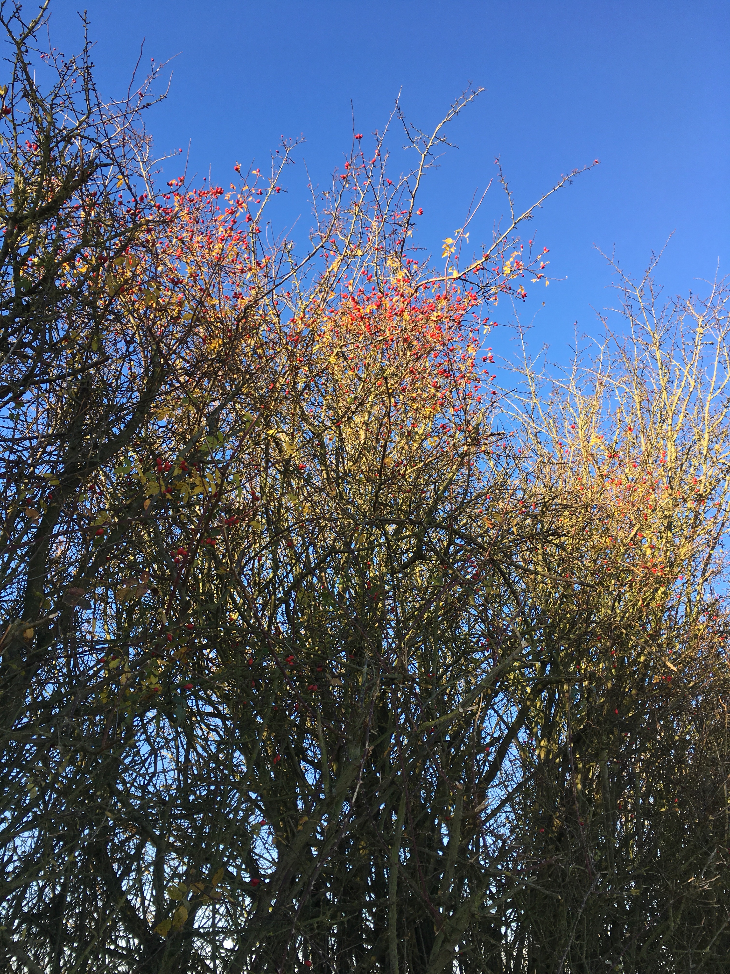 And yet, there is a glimmer of hope. Nature always supplies something to hearten, even something small and relatively insignificant. I find rosehips in abundance. Glowing red and spangled with raindrops. Food for the birds. I care about the birds and their survival, and am glad to see the rosehips and hedges full of hawthorn berries.