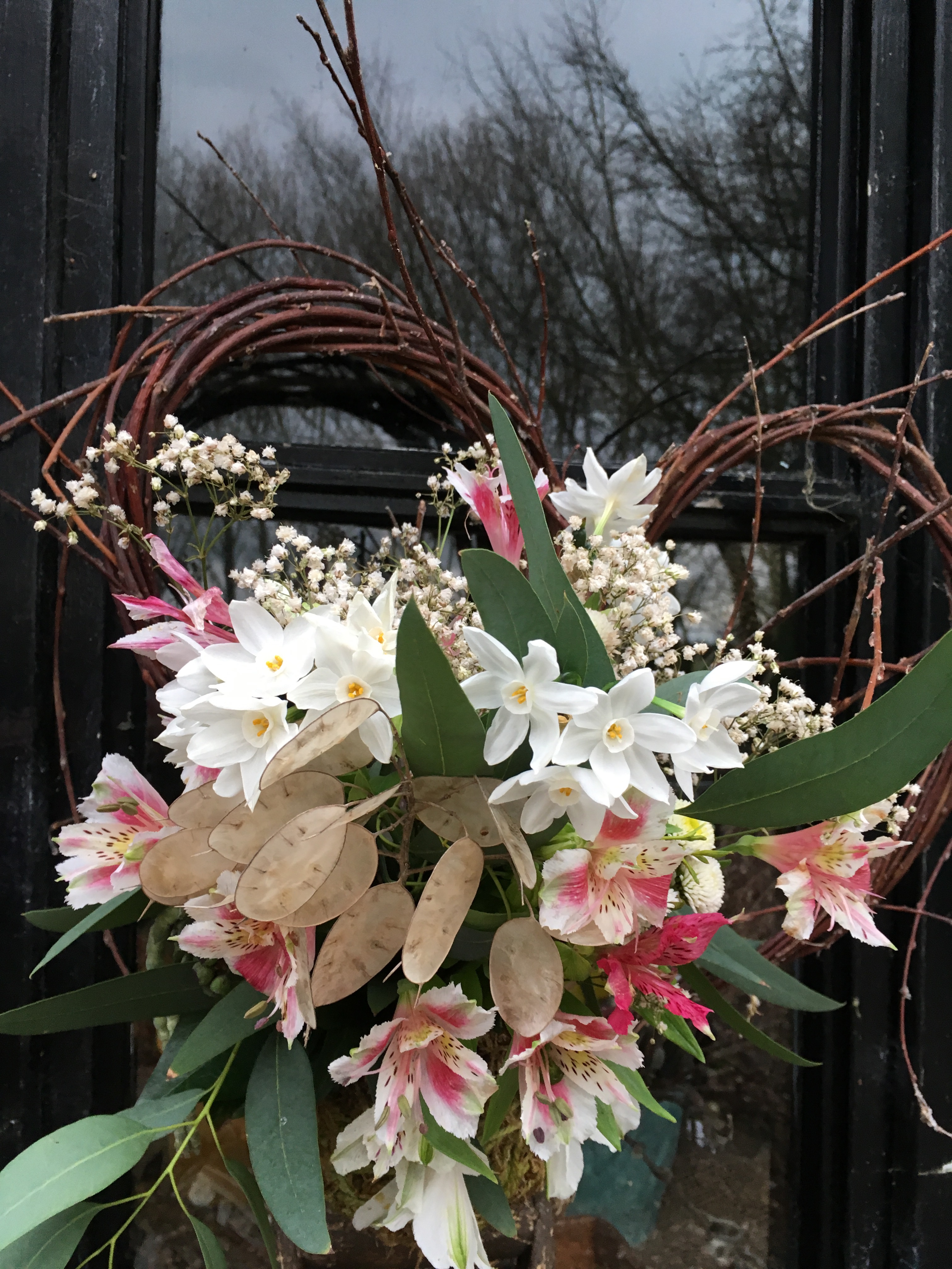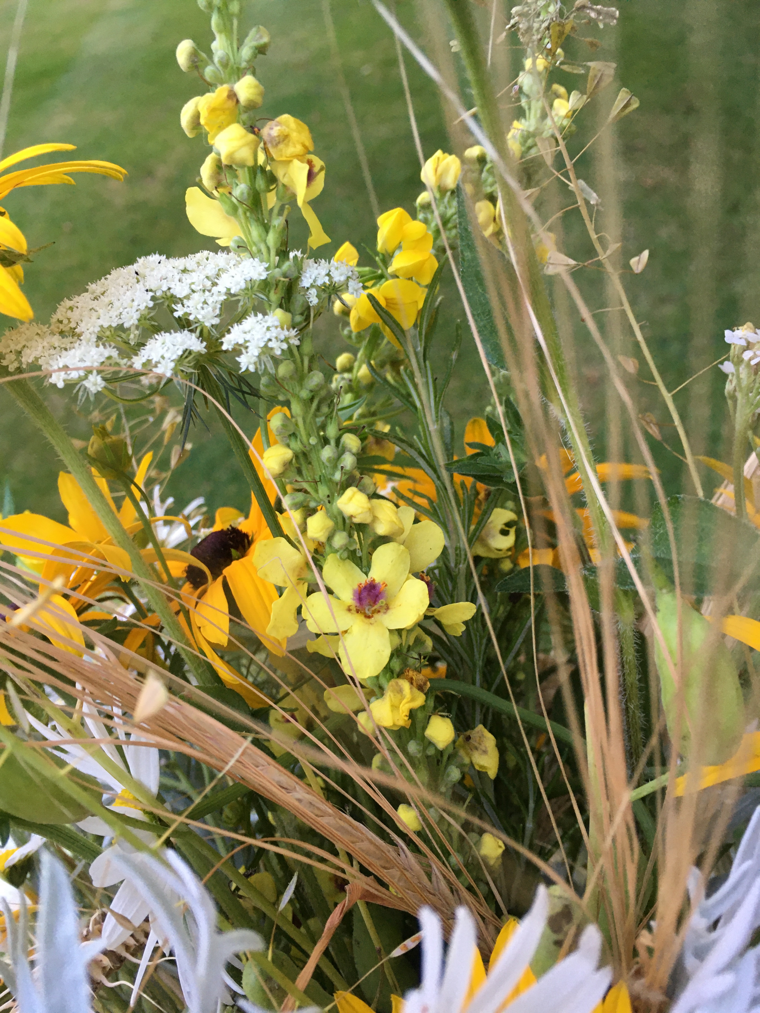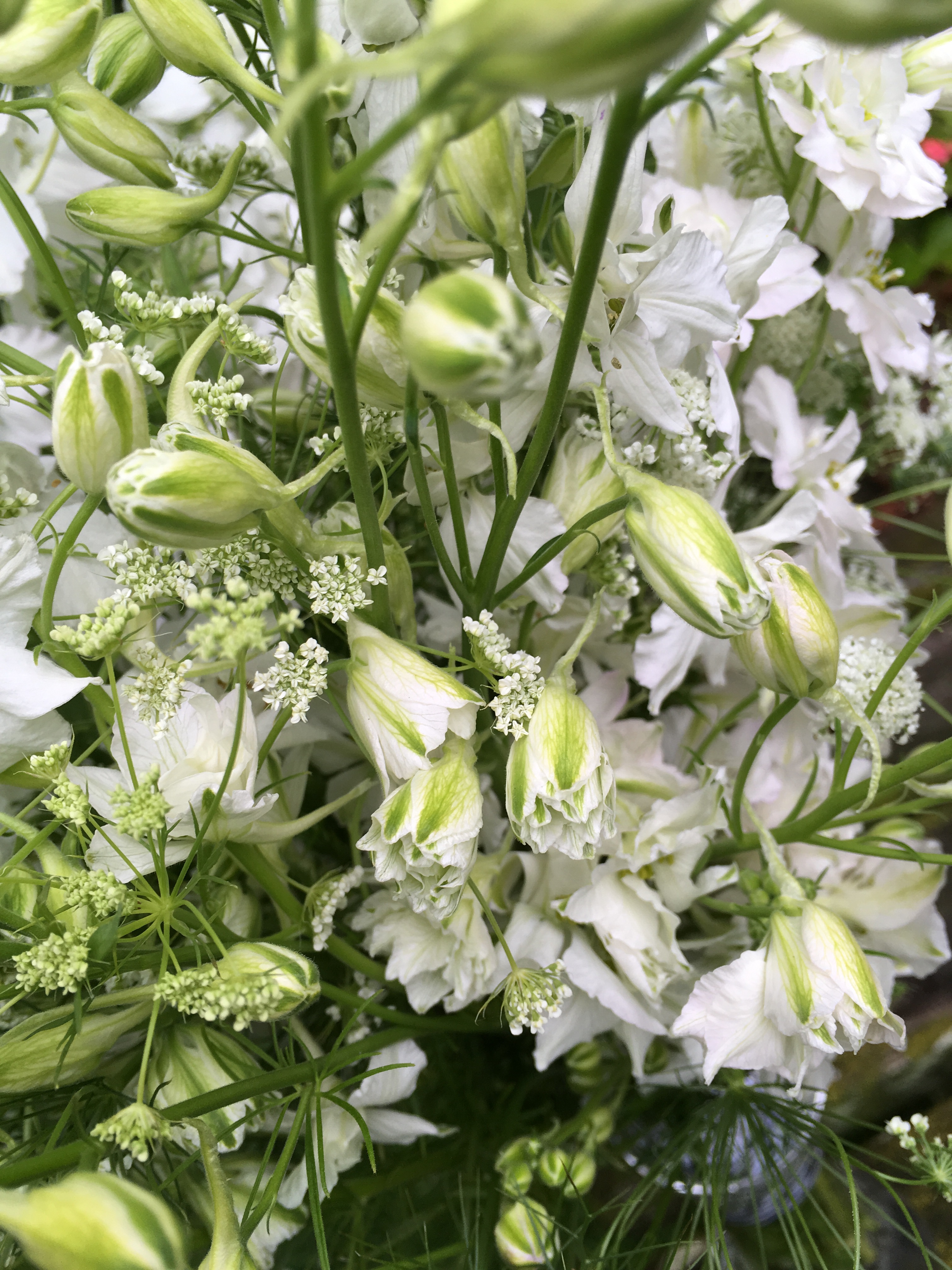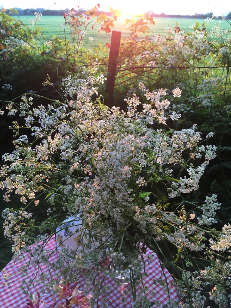 Don’t forget that cow parsley can be used even when the flowers are going over. The little lime green seed heads are still attractive. I also use seed heads of parsnip, onion, carrot, chives, mustard and leeks. I found out by accident by leaving some vegetables to go to seed. I now leave them on purpose to supply free seed heads for floristry. Fluffy clematis seeds are also saved for winter decorations.