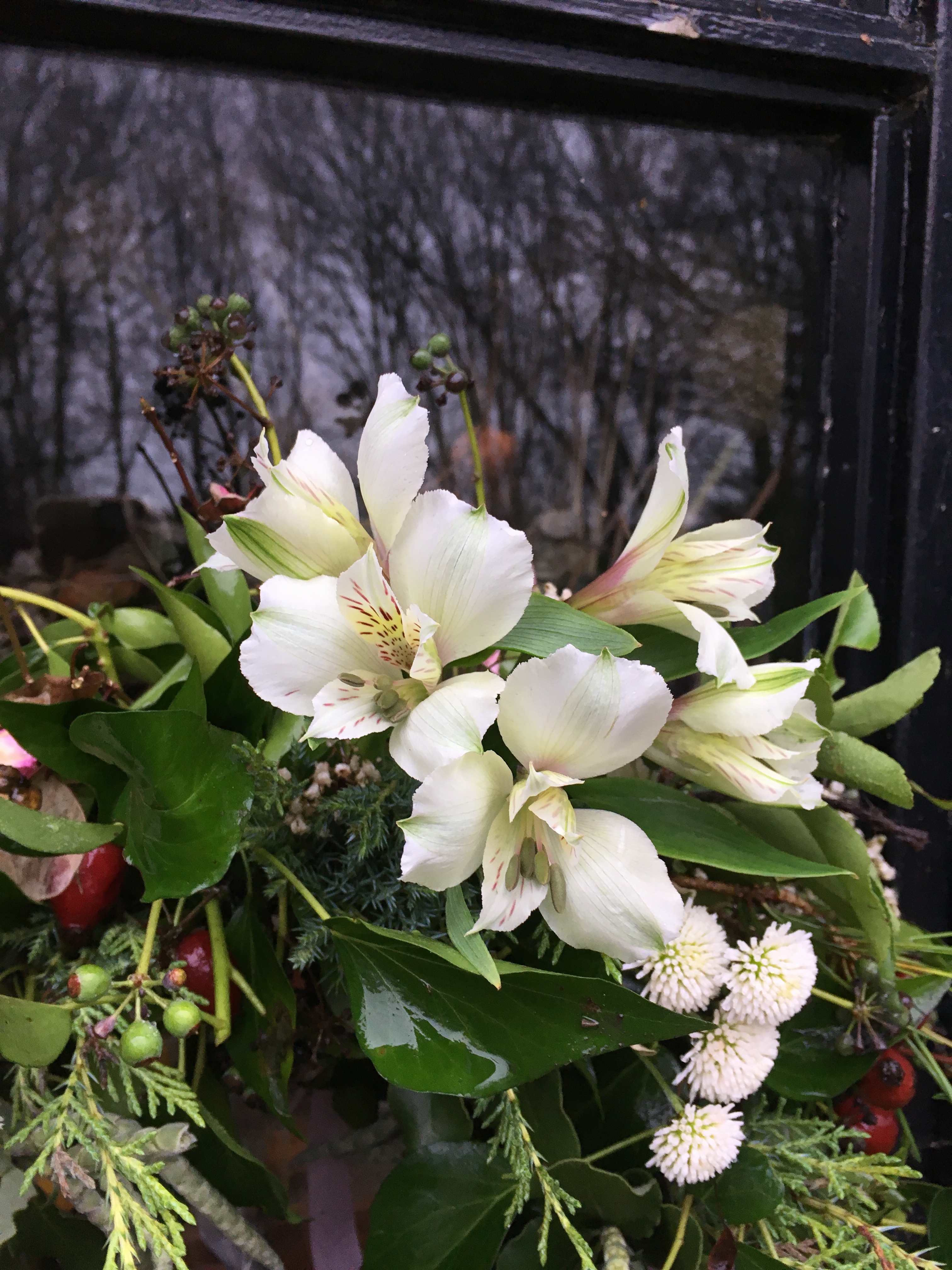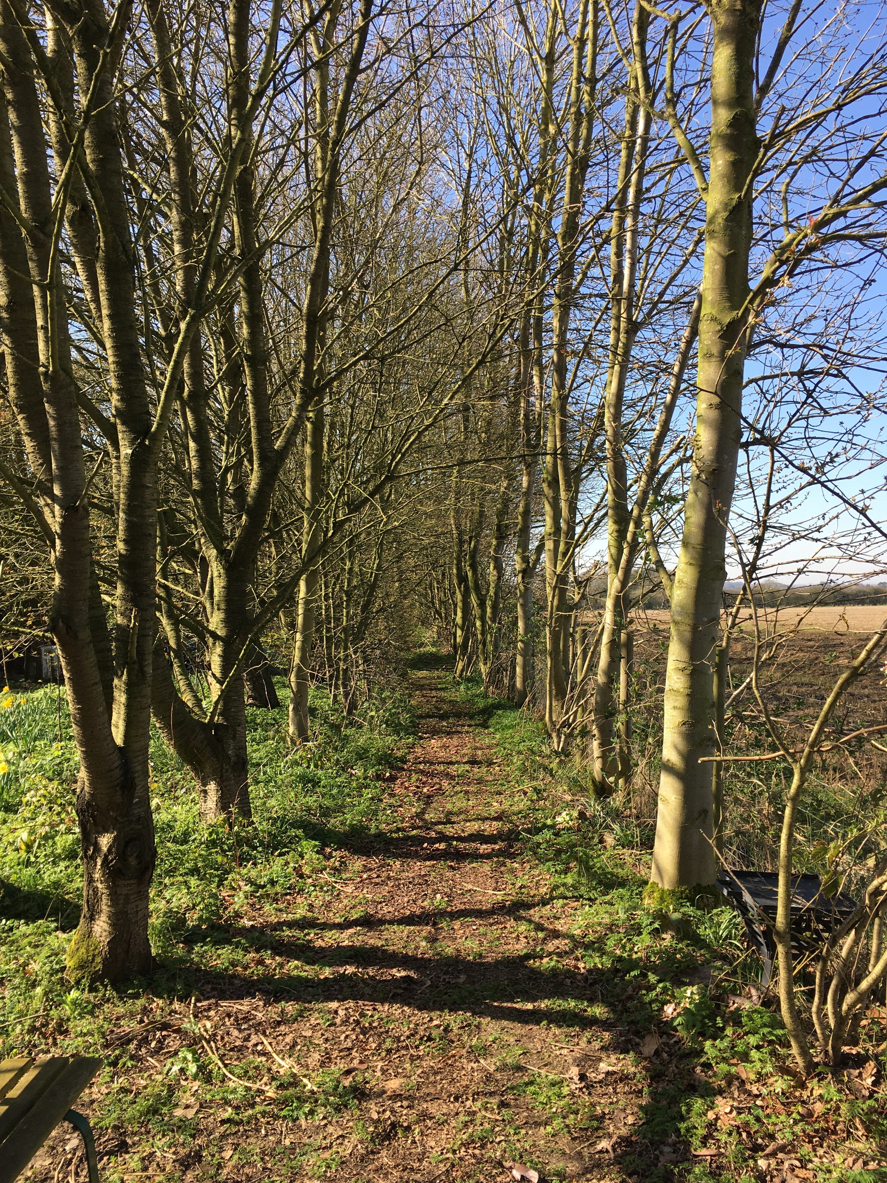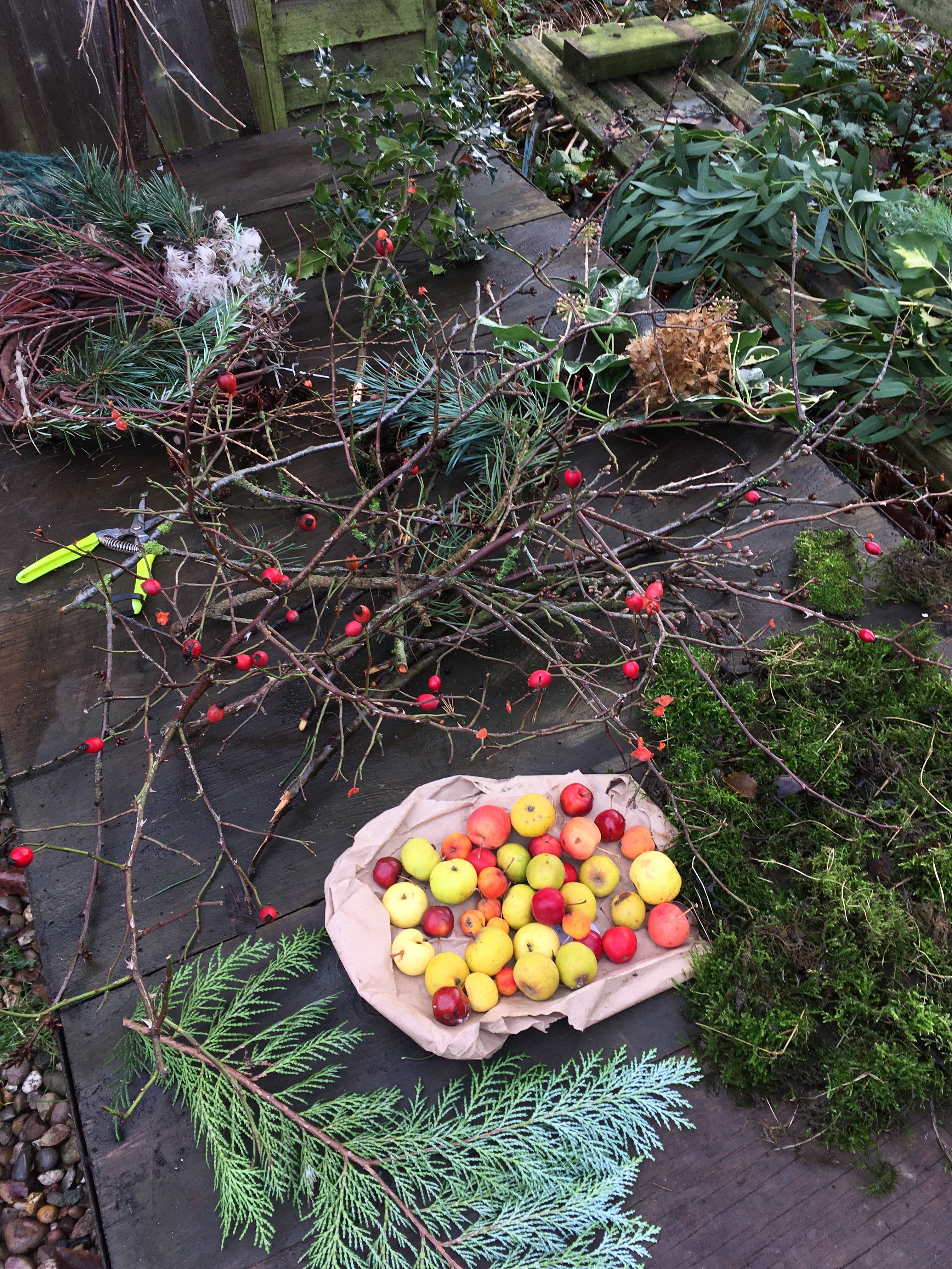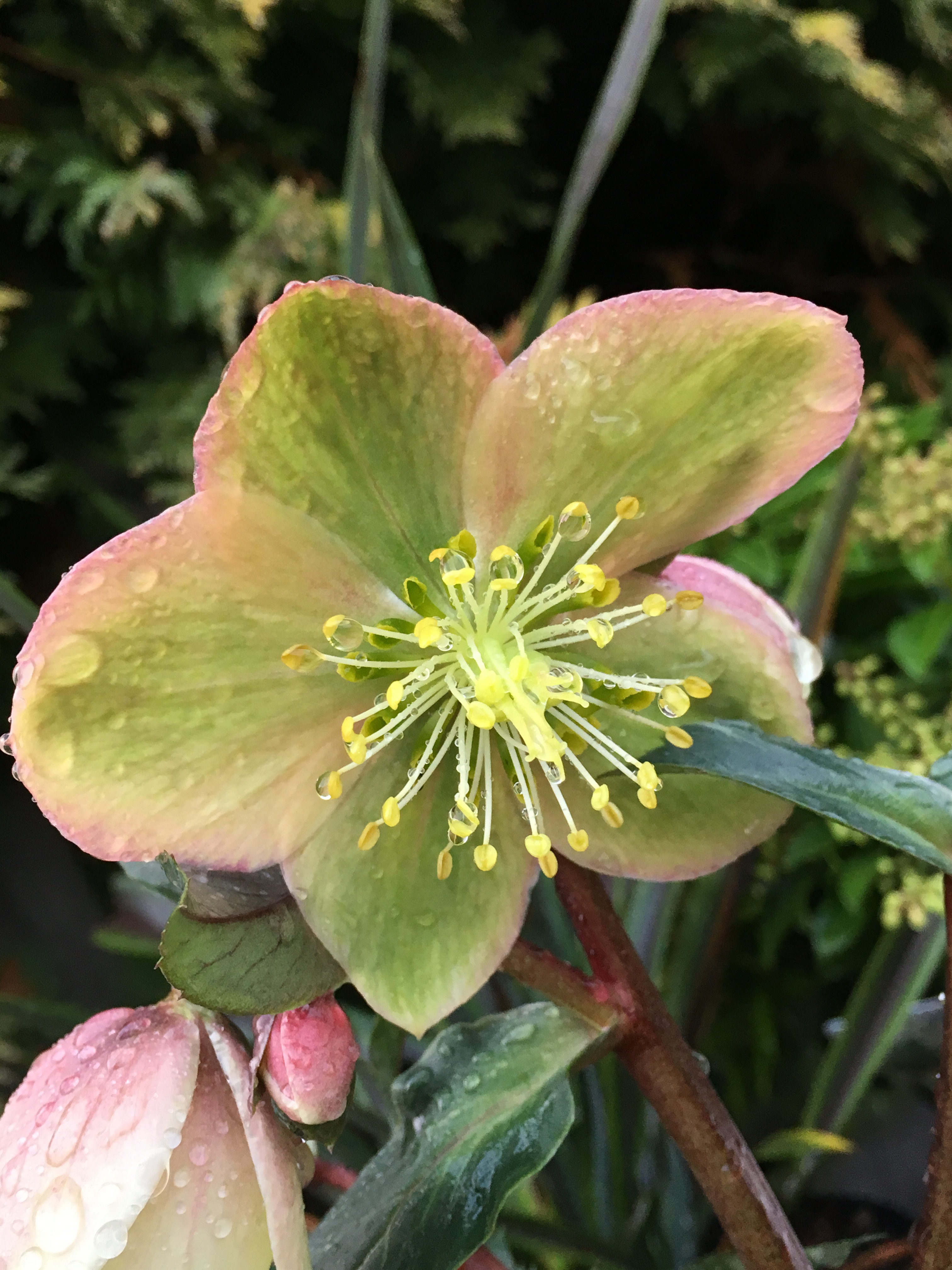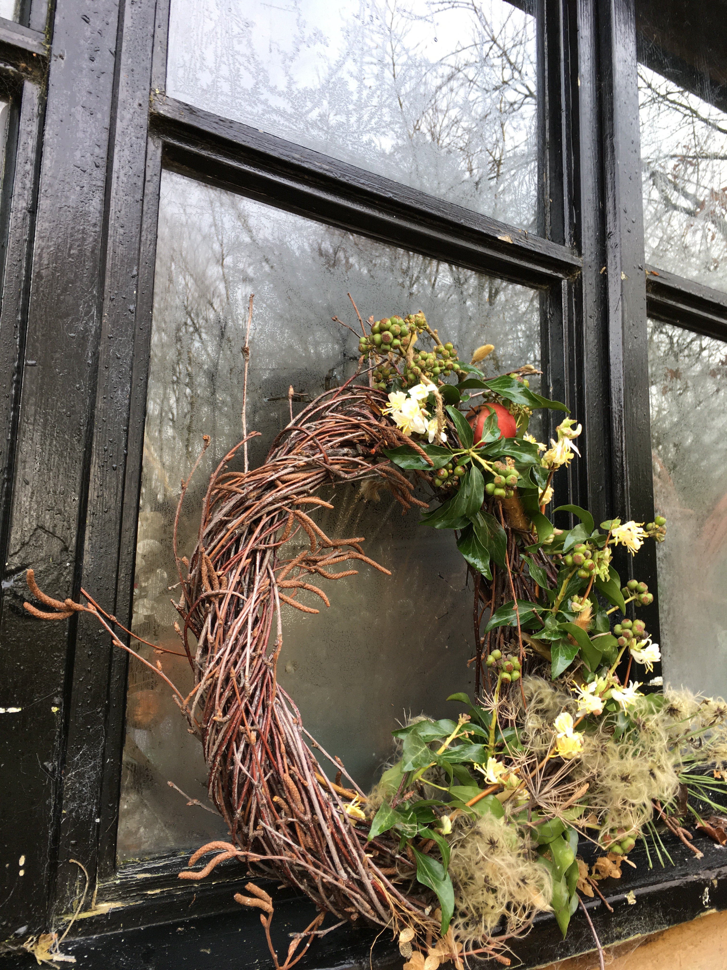 Here’s a view of the garden today. The hawthorn hedge looks like seafoam in the wind. Looks like there will be more rain, judging by the colour of that sky.